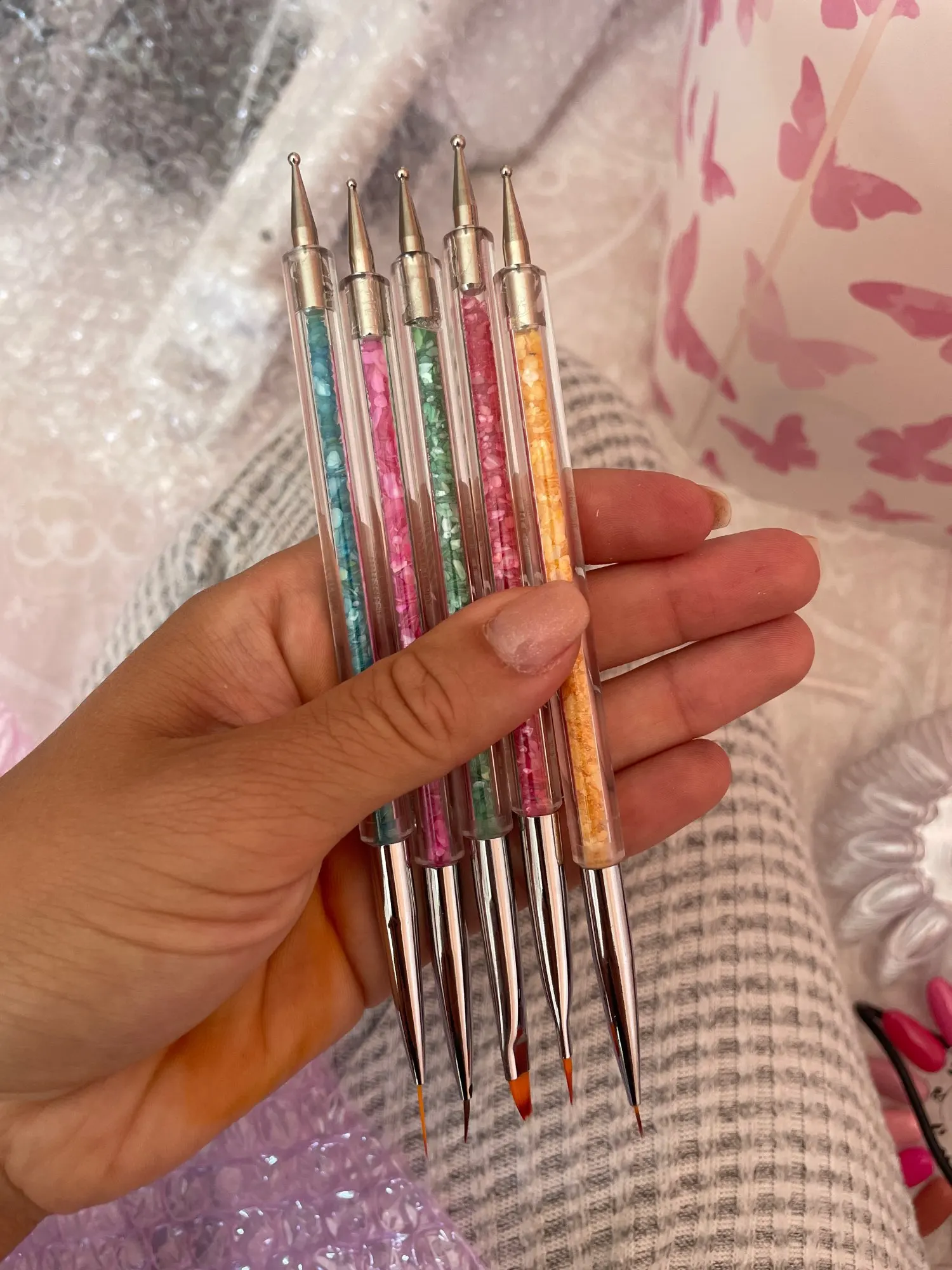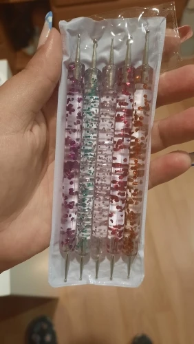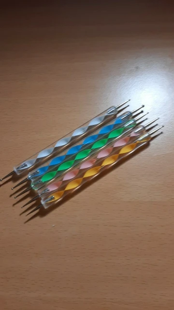Muy buen producto. Resistende, de fácil limpieza, se maneja muy bien, apenas pesa, compatible para todo tipo de esmaltes. Las puntas son de diferentes grosores y vienen 5 punzones con dobles puntas, lo que facilita su uso