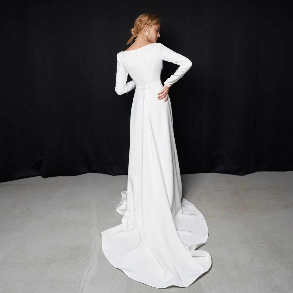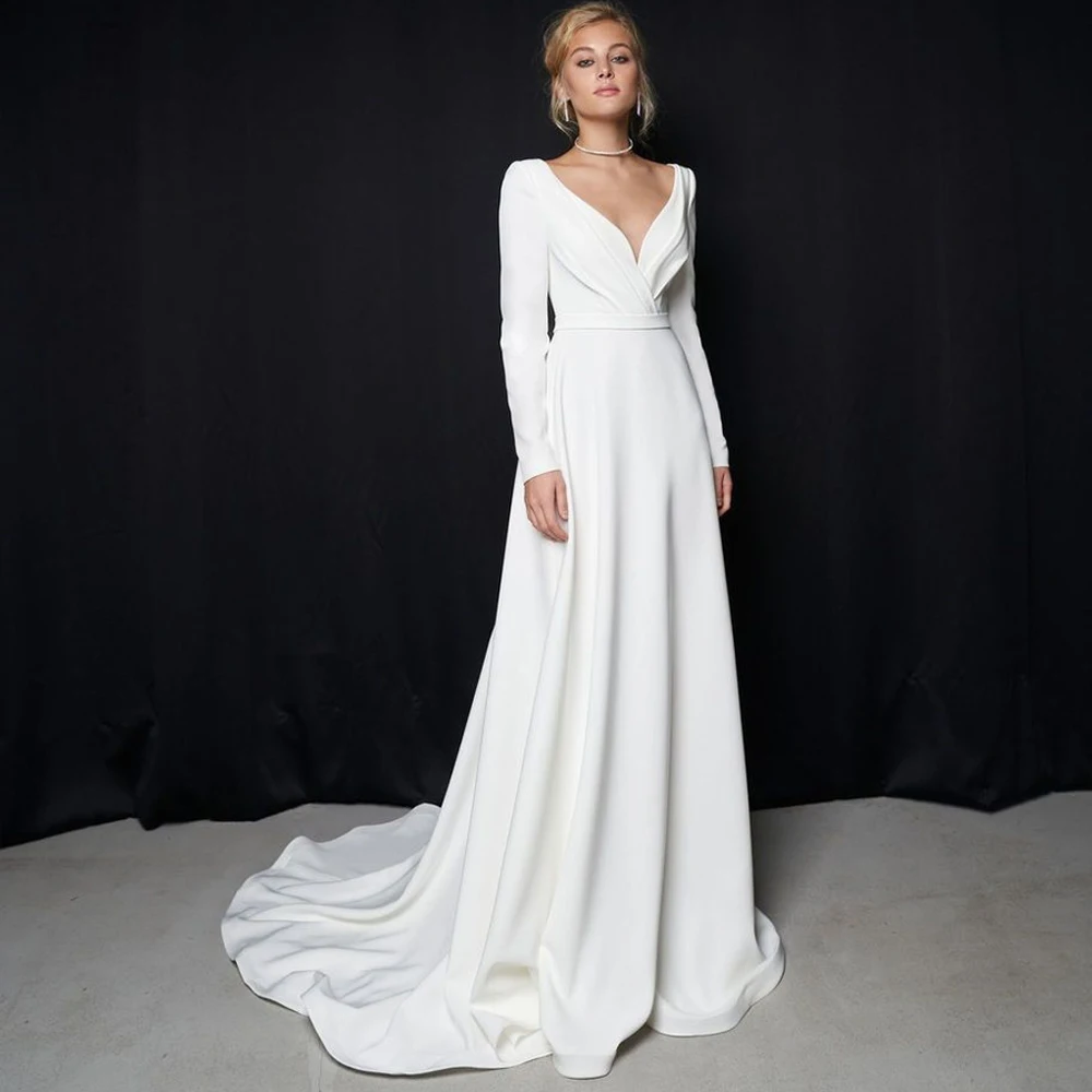 Плиссированное атласное свадебное платье А-силуэта, винтажное свадебное платье с длинными рукавами, V-образным вырезом, индивидуальный пошив, 2021, свадебное платье на молнии с закрытой спиной и шлейфом