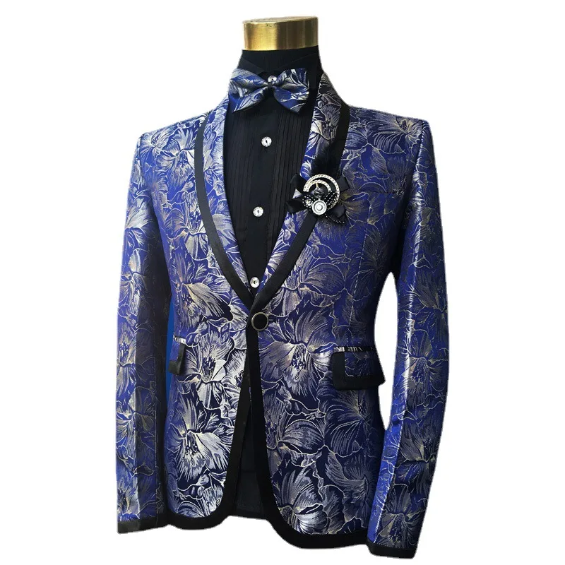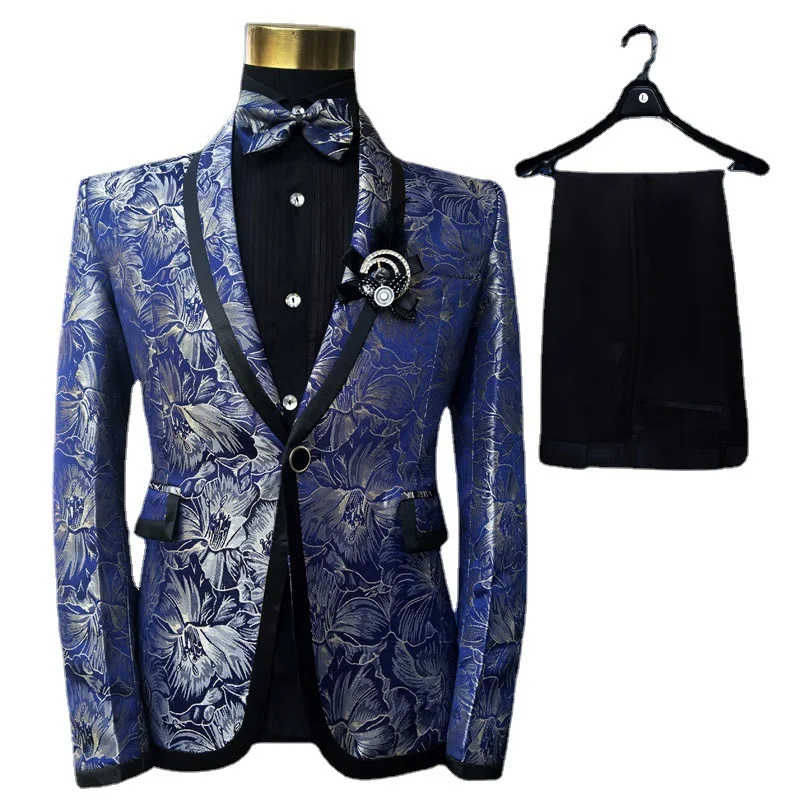 Мужской Жаккардовый комплект из 3 предметов, жаккардовый костюм с синим цветочным узором и отложным воротником, костюм для свадьбы, жениха, певицы, выпускного вечера, новейший дизайн, пальто и брюки
