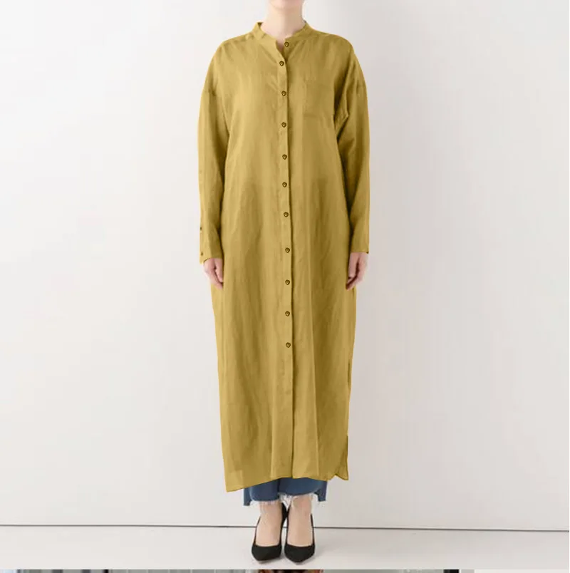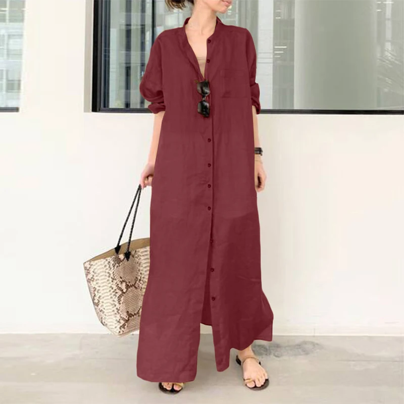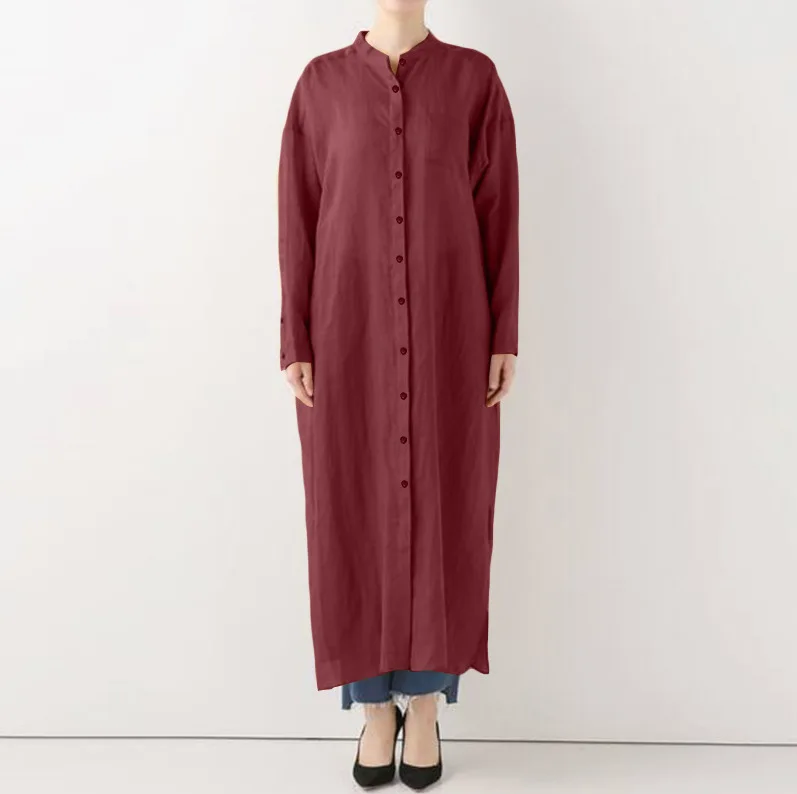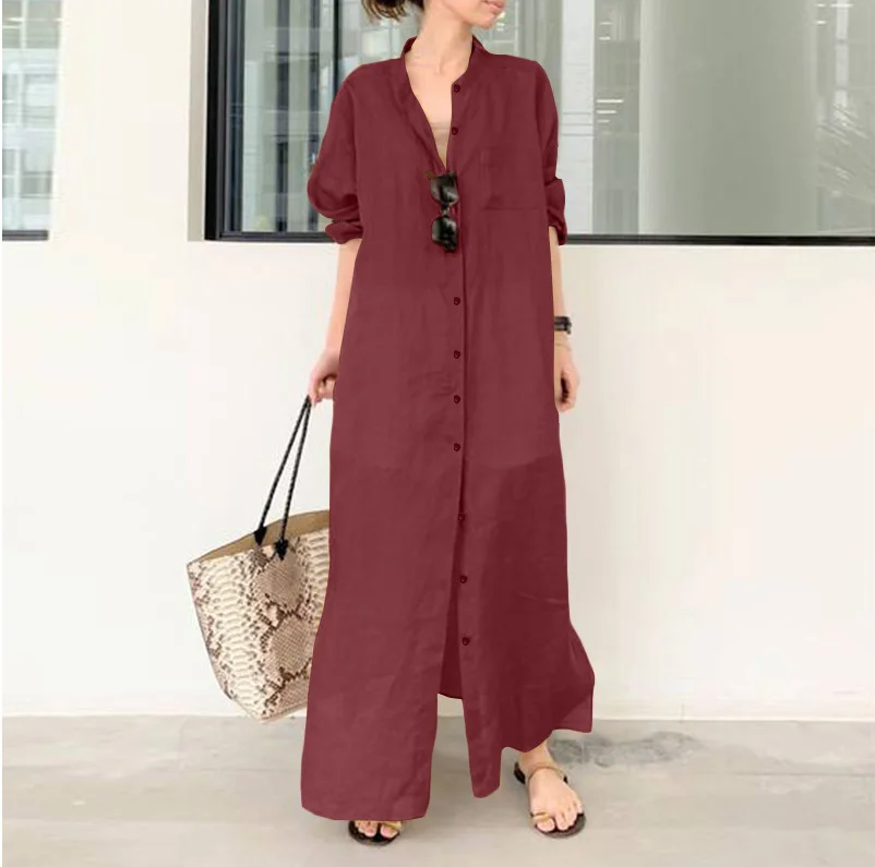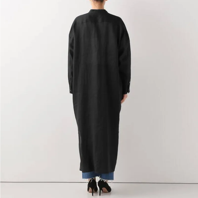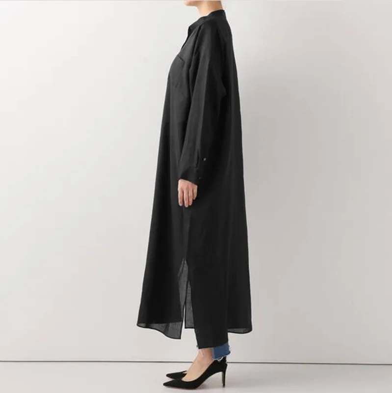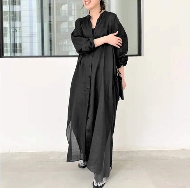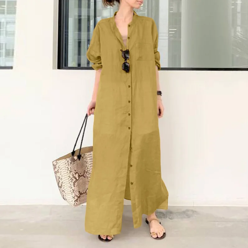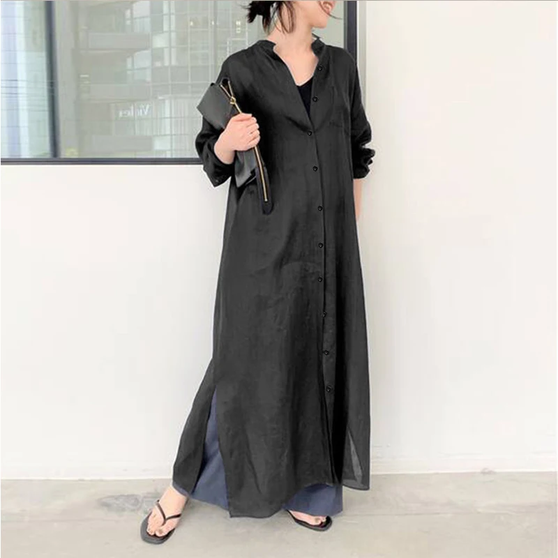 Осень 2021, элегантное однотонное рабочее платье-рубашка, Макси Сарафан, женское хлопковое льняное платье с длинным рукавом, женское платье