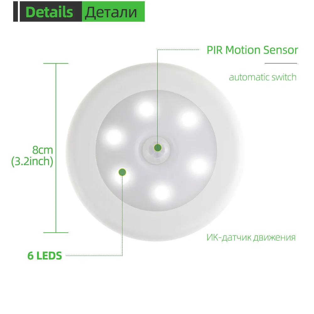 Особенности1. Тип переключателя: пироэлектрическая инфракрасная индукция2. Датчик движения автоматически включает и выключает светодиодный ночник3. Беспроводной, питание от аккумулятора, использует 3 батарейки ААА (батарейки в комплект не входят)4. Автоматическое отключение через 15-30 секунд без движения предотвращает разряд батареиХарактеристикиМатериал: АБСКоличество лампочек: 6 светодиодовТип: ночное освещение с датчиком движенияСрок Светодиодный Дов: 30,000 часов и болееИсточник питания: 3 батарейки типа ААА (не входят в комплект)Мощность: 3 ВтЦвет светильник: 3000K теплый белый/6500K дневсветильник белыйУгол чувствительности: 120 градусовСупер чувствительность: Расстояние 1-3 метраРабочая температура:-20 °C-40 °CСветоизлучающее время задержки исчезновения: 10-15 секундРазмер: 80x18 ммПосылка1 * датчик движения (батарея в комплект не входит) 1*3 м Двусторонняя клейкая прокладкаПримечаниеУбедитесь, что батареи установлены правильно. Светильник не будет работать и даже будет уничтожен, если анод и катод батареи связаны с неправильным направлением.