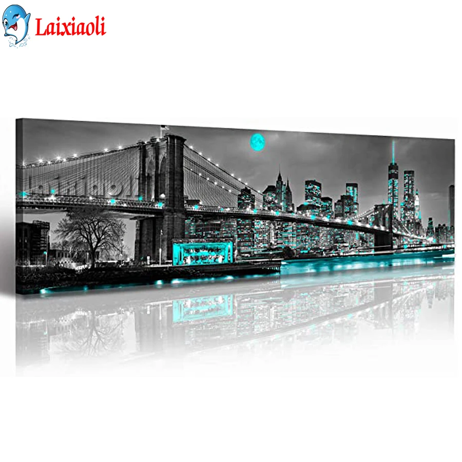 Алмазная картина Бруклинский мост Нью-Йорк горизонт ночной город Мозаика Черный Белый Аква зеленый голубой Нью-Йорк пейзаж большой размер