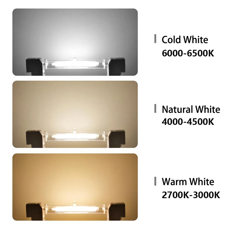 Спецификация: Название продукта: стеклянный COB R7S светодиодный светильник Выходная мощность: 78 мм-5 Вт/10 Вт 118 мм-10 Вт/20 Вт Тип основания: R7S Светодиодный чип: чип COB Входное напряжение: 220 В переменного тока Угол луча: 360 градусов Температура тела: < 80 Светодиодный температурный режим работы: -40 C ~ + 55 C (Чип на плате) Срок службы: 50000 часов Сертификация: CE & RoHS Цвет излучения: теплый белый/холодный белый/натуральный белый