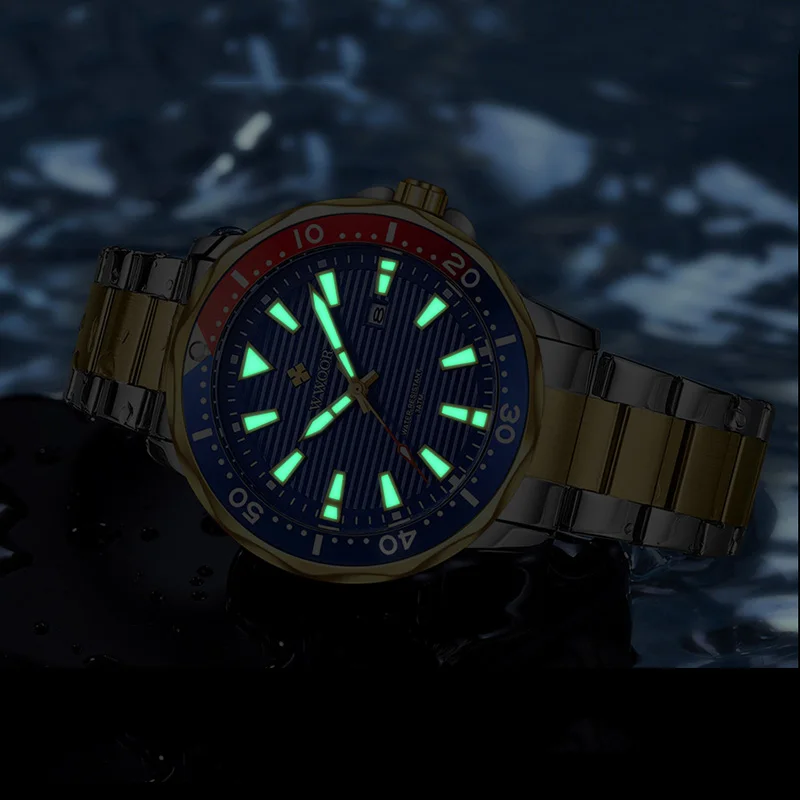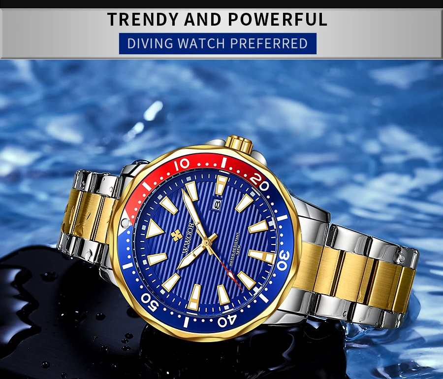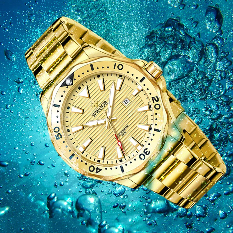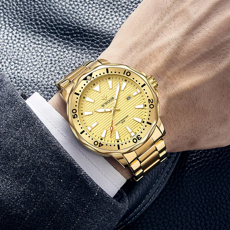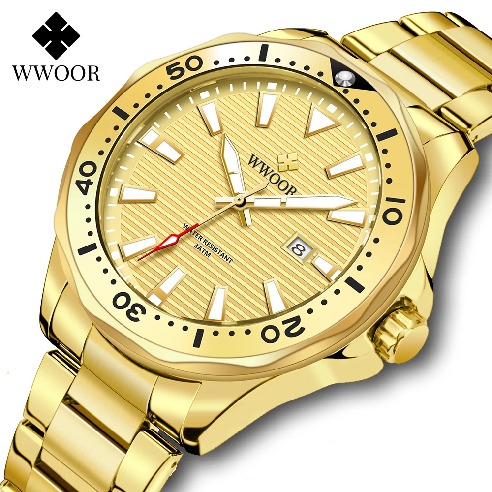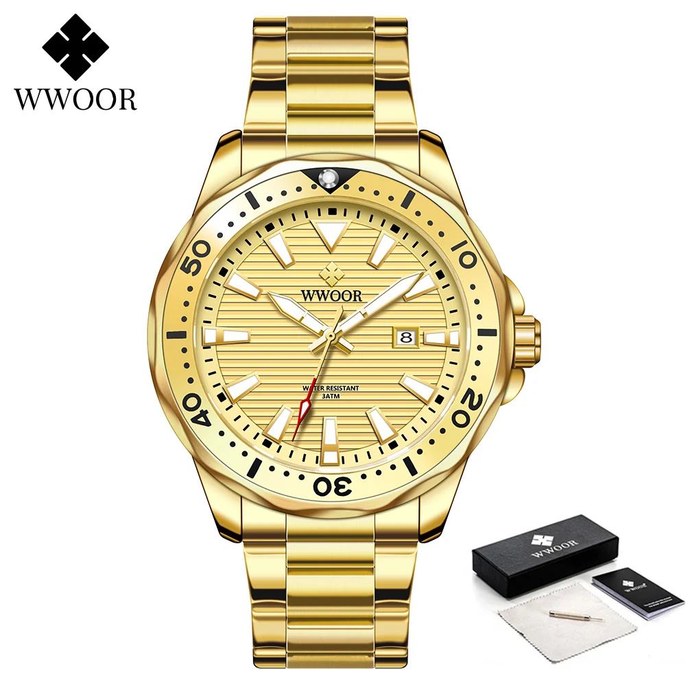 2021 Новый WWOOR модные спортивные часы для дайверов для мужчин Роскошные Позолоченные Кварцевые часы из нержавеющей стали светящиеся Водонепроницаемый военные наручные часы