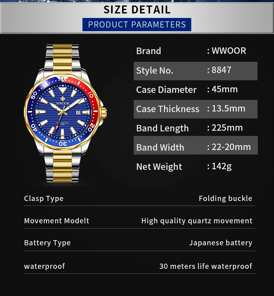 Бренд: WWOOR 8847(2021 Новый)-Дисплей: аналоговые кварцевые часы-Стиль: Модный, Деловой, роскошный, простой-Особенности: Водонепроницаемость, ударопрочность, плавание, Автоматическая Дата, светящийсяОсновная особенность:-3 АТМ/30 М Водонепроницаемость (поддержка холодного душа и плавания, не использовать часы под водой, не поддерживать горячую воду);-Качественный чехол из цинкового сплава;-Качественная полоса из нержавеющей стали;-Чехол Диаметр: 45 мм-Чехол Толщина: 12 мм-Ширина ремешка: 22 мм-Общая длина: 22 см Посылка включает в себя:-Часы WWOOR-1 шт.-1 x Подарочная коробка WWOOR-1 x чистая ткань-1 инструмент для регулировки ремешка