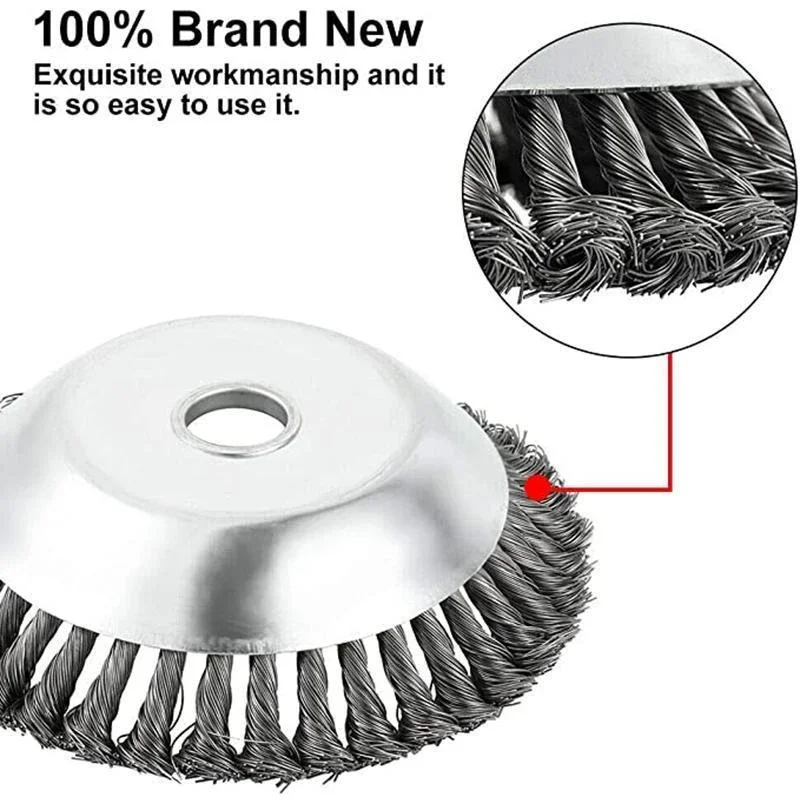 Подходит для большинства моделей триммеров сорняков, этот вид стальных щеток в основном подходит для удаления заусенцев, удаления пыли, очистки сварных швов, смешивания краев и полировки аксессуаров, подходит для углового шлифовального станка