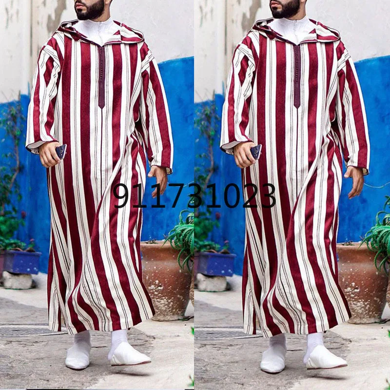 Ислам абайя мужская одежда мусульманские платья Длинные 2021 с v-образным вырезом цвет красный с капюшоном прямые Полосатые Модные свободные мужские платья 2021 лето