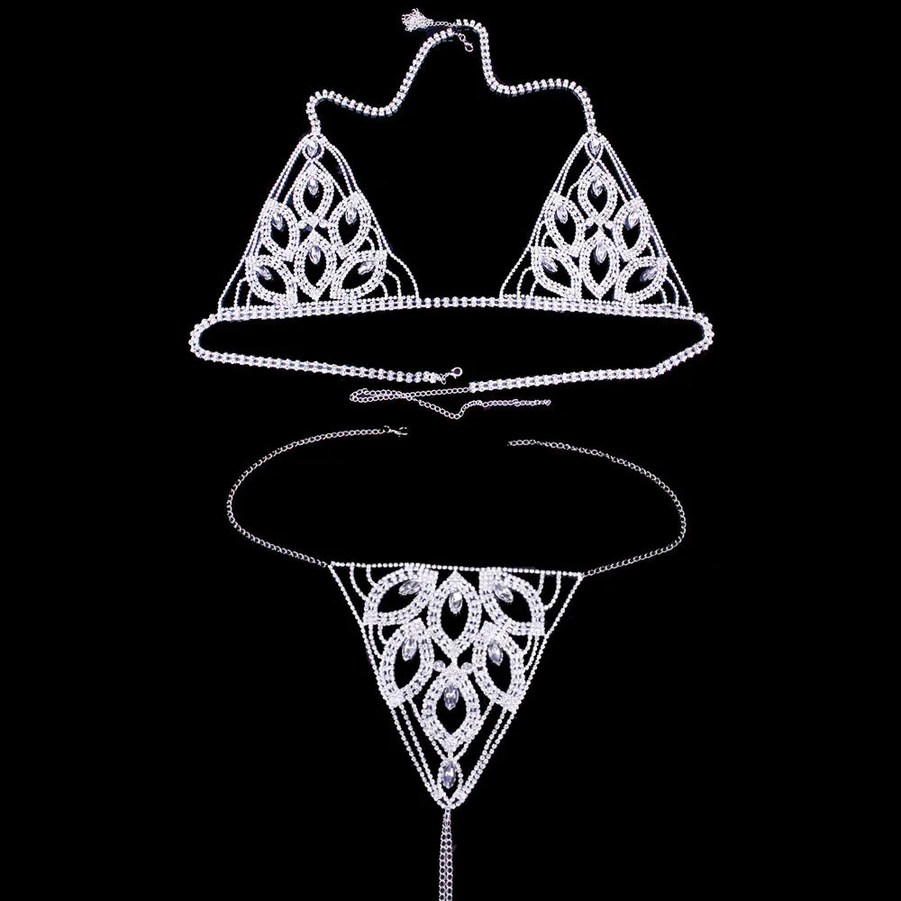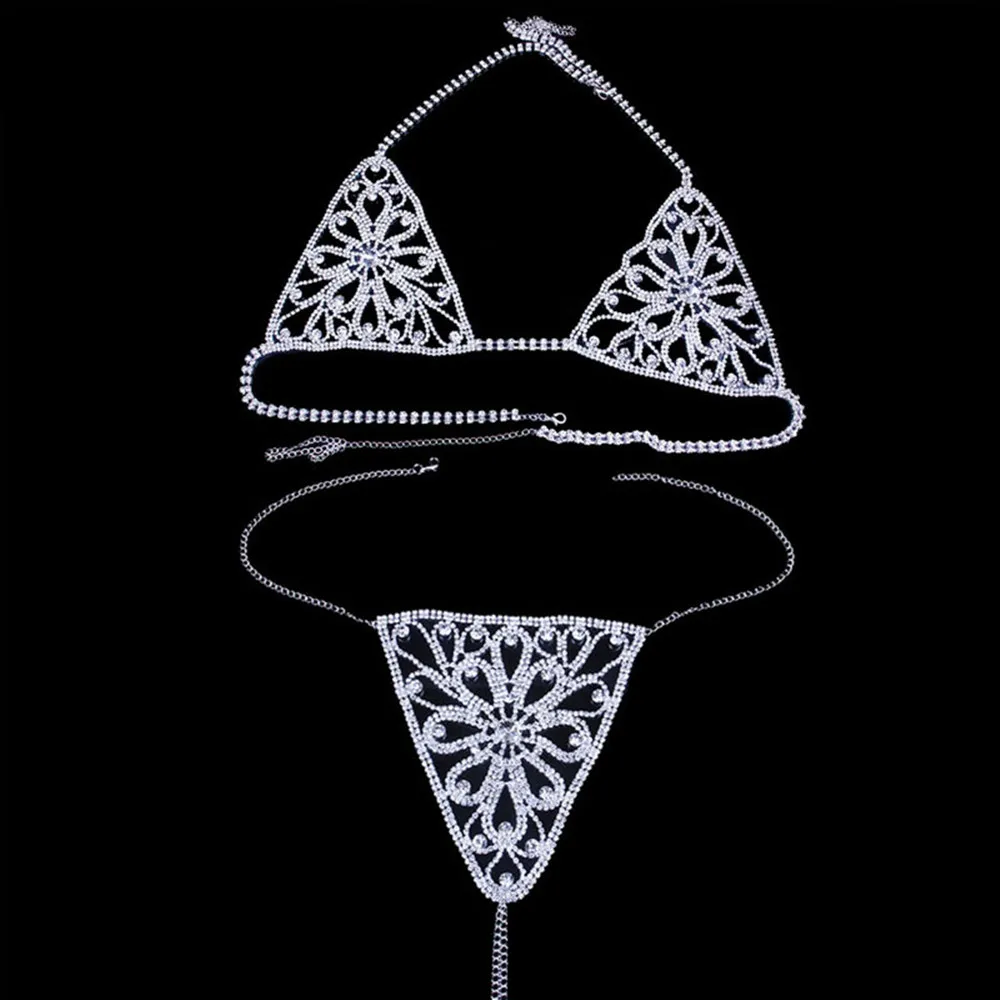 Комплект женской портупеи из бюстгальтера и стрингов, роскошный пикантный бюстгальтер с цепочкой на грудь с блестящими кристаллами, бикини, Ювелирное Украшение для тела