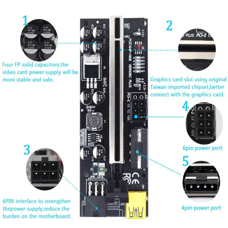 PCI-E Riser 009C Plus, светодиодный расширитель 1X 4x 8x 16x, расширитель PCI E USB, Райзер 009S, графический процессор, двойной 6-контактный адаптер, карта SATA, 15-контактный Майнер