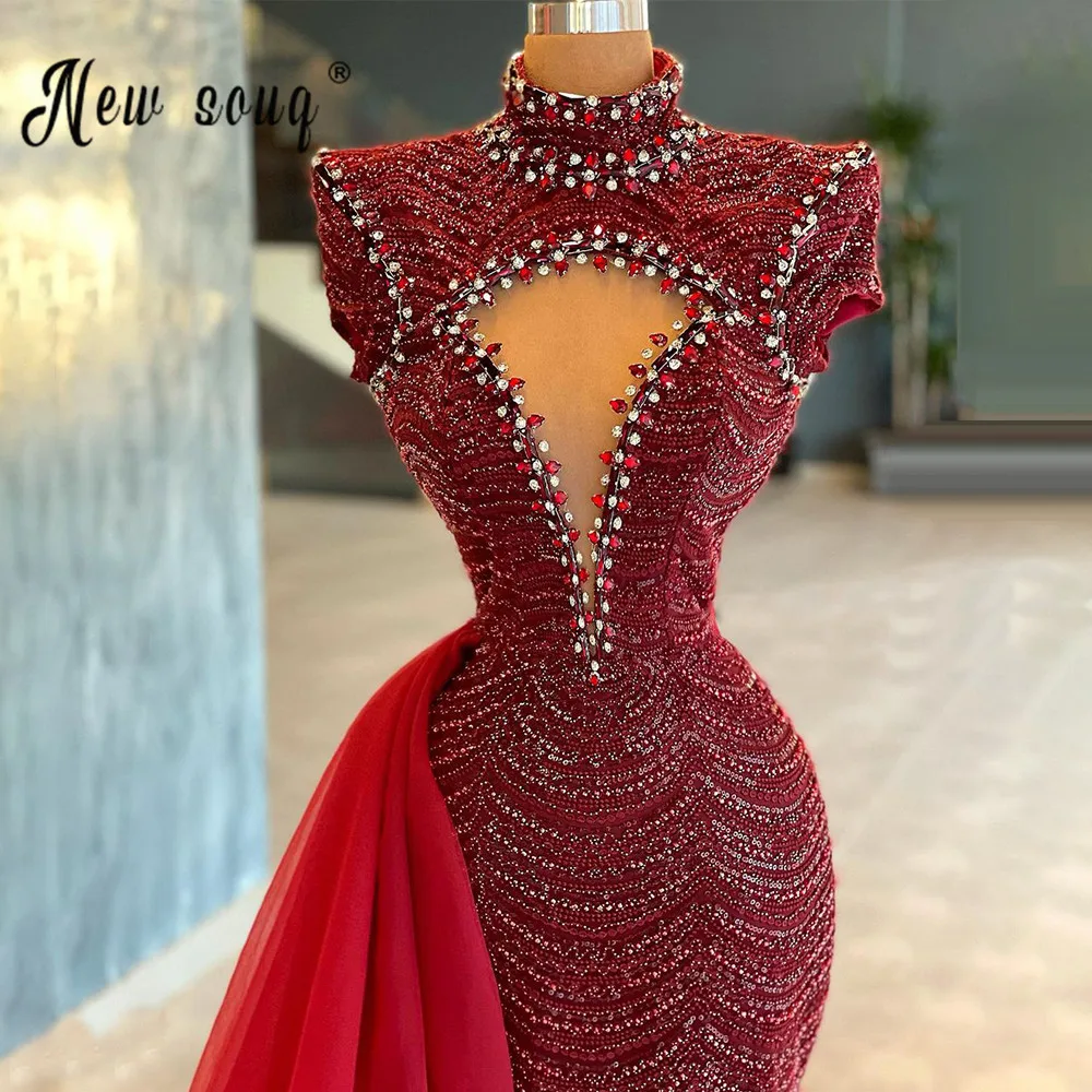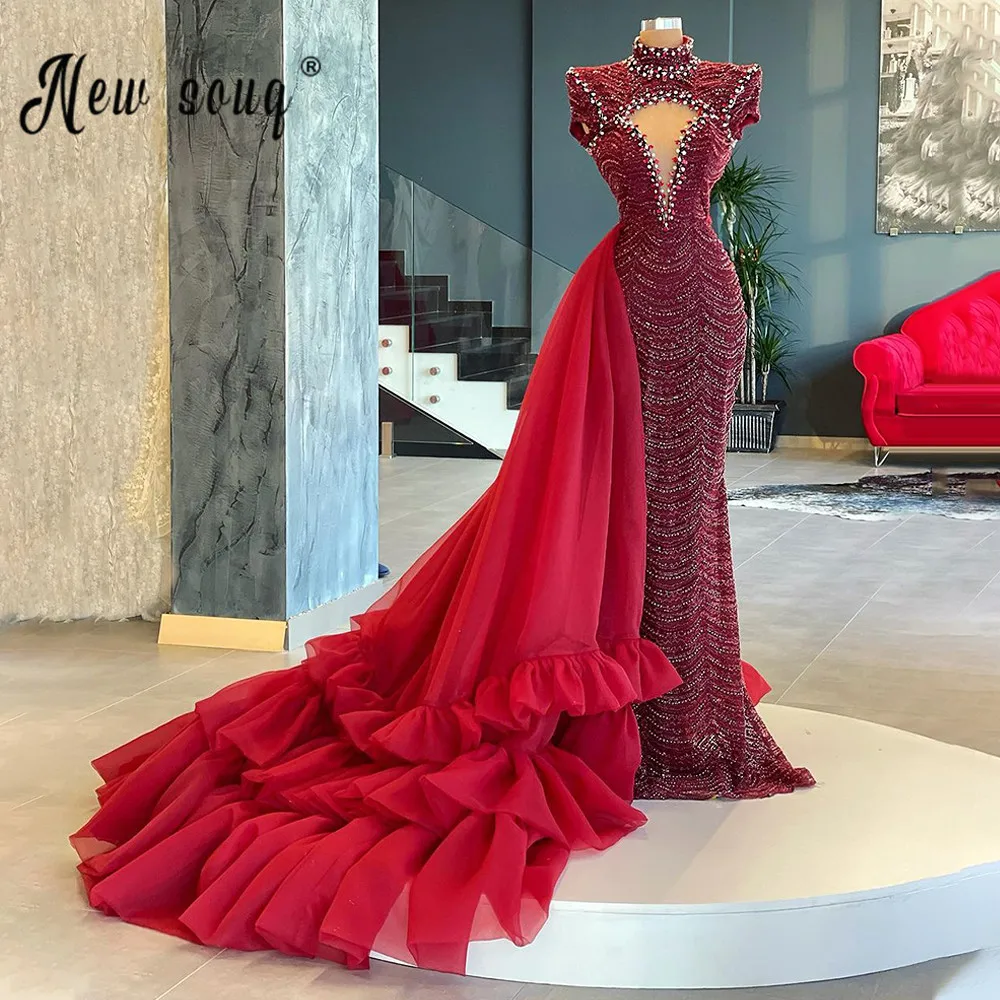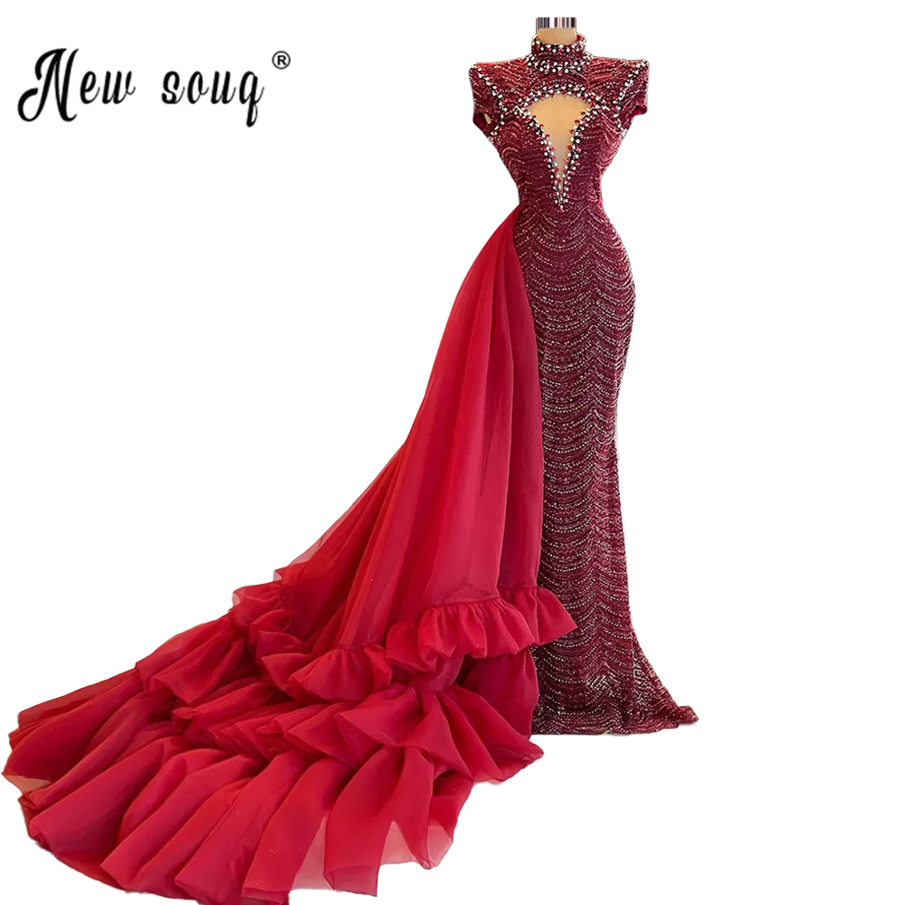 Красное красное блестящее вечернее платье с кристаллами и бисером, длинное платье с высоким воротом для выпускного вечера, женское платье с оборками сзади, Vestidos De Fiesta