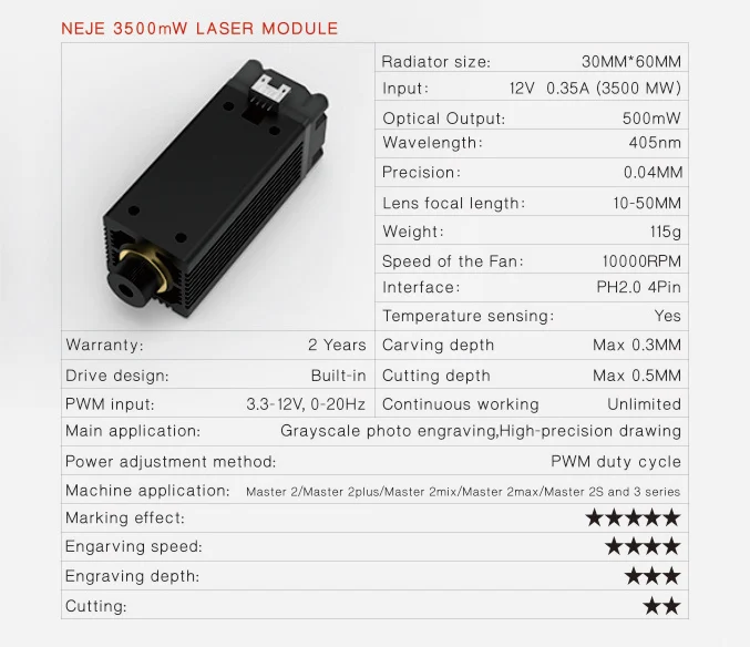* Программное обеспечение: Программное обеспечение NEJE/приложение* Материнская плата: 2 MCUs (GD32 MCU + STC)* Мощность лазера: 7 Вт (вход лазера: 12 В 0,75 А) / 20 Вт/3500 МВт (405нм, для портретной гравировки)* Светящийся цвет: синий* Длина лазерной волны: 450нм* Формат изображения:.nc \. Dxf \. Bmp \. Jpg \. Png и т. Д.* Размер изображения: 2000*2000 пикселей/0,075 мм точечное расстояние* Система поддержки: Windows 7 (необходимо установить. Среда программного обеспечения net 4,8), Windows 8,1, Windows 10 и выше (не поддерживает windows XP )/ Macbook/iOS/ Android(NEJE wireless)* Напряжение питания машины: 12 В 2 АПредупреждение о безопасности: пожалуйста, примените этот модуль под предпосылкой безопасности! Изделия могут быть вырезаны, в том числе: оксид алюминия, красное дерево, бамбук, бумажные карты, кожа, легковоспламеняющийся пластик, печатная плата и т. д.Не выгравировать: металл/стекло/камень/керамика/нержавеющая сталь/светоотражающий материал/прозрачный материал