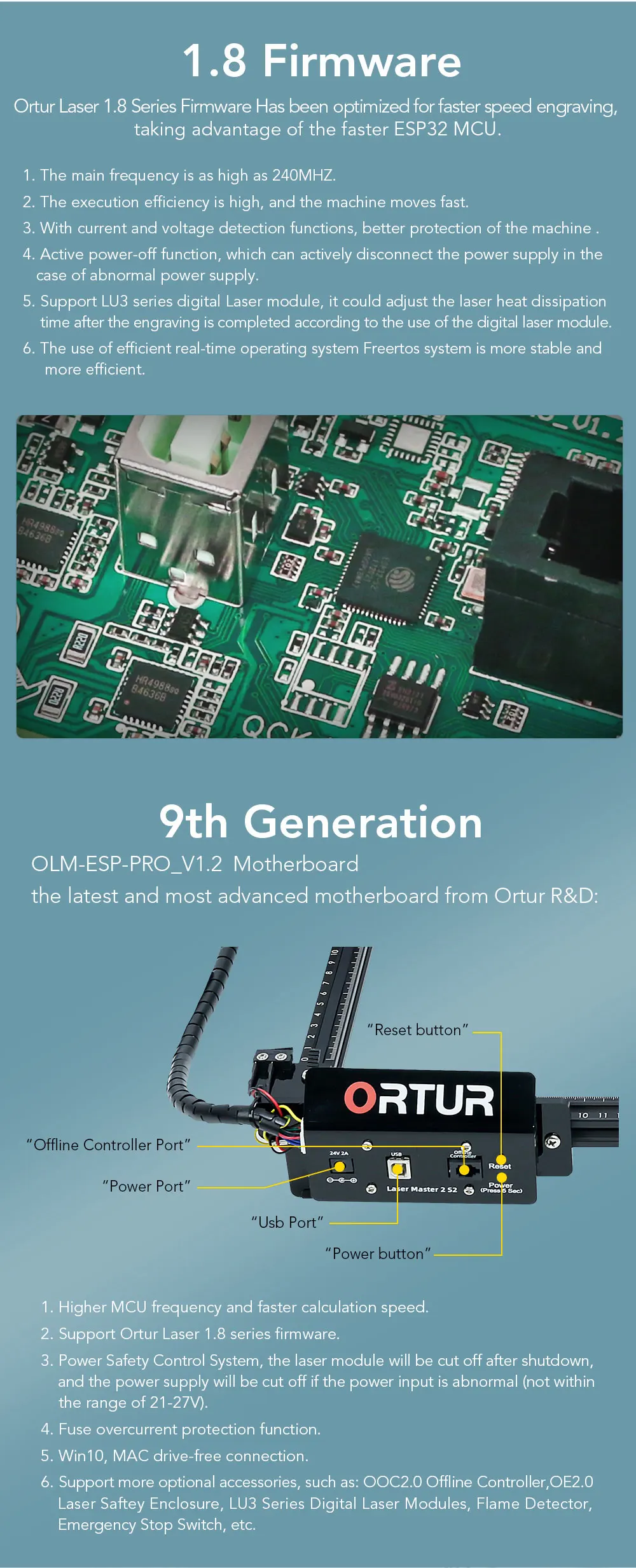 Краткое описание:● Лазерный мастер 2 - 7 Вт хорошо подходит для гравировки изображений.● Лазерный мастер 2 - 15 Вт является наиболее экономически эффективным, доступен как для гравировки, так и для резки.● Лазерный мастер 2 - 20 Вт обладает более высокой мощностью и поддерживает более быструю гравировку и резку.Основные характеристики:●Специализированная материнская плата с MCU STM32Он может обрабатывать 32 инструкции, поддерживать скорость передачи данных до 921600, более мощный!●Самые передовые 32 бит лазерный гравер прошивкаOrtur laser master прошивка, умнее, быстрее, более высокая точность и проще в использовании.● Диапазон мощности лазера может быть S0 - S1000, по сравнению с 8 битами настольных лазерных гравировальных станков, которые имеют только S0 - S255, Ortur лазерный мастер может контролировать лазерный луч более точно, может даже использовать лазерное устройство высокой мощности, чтобы «нарисовать» изображение на бумаге, О том, что 8 бит высокой мощности лазерные гравировальные инструменты не смог нажать на кнопку.● Скорость гравировки может достигать 3000 мм/мин. (Если не считать результат лазерной резьбы, скорость движения может достигать 1000 мм/сек.)●Защита активного положенияНа материнской плате есть g-сенсор, если машина обнаруживает неавторизованное движение, лазерный луч остановится.●Защита лазерного лучаЕсли ваша компьютерная система остановлена или USB кабель отключен, привело к тому, что лазерный гравер останавливает движение, лазерный луч остановится, чтобы предотвратить пожар.●Обнаружение и ограничение длительности экспозицииЕсли лазерный гравер находится под контролем, но пользователи забывают работать и поддерживать работу лазерного луча, дополнительная безопасность отключится, чехол остановит движение двигателя, чтобы предотвратить пожар.● LaserGRBL (бесплатное программное обеспечение) поддерживает Windows XP, 7, 8, 10. LaserGRBL является самым популярным программным обеспечением для резьбы в мире, может импортировать различные форматы изображений, вы можете редактировать в PhotoShop, Inkscape, CAD и т. Д., а затем подключаться к граверу с помощью лазерного LaserGRBL для гравировки и резки.● LightBurn (Платное программное обеспечение, lightburnsoftware.com) поддерживает Windows, Mac OS и Linux. Это самое популярное Платное программное обеспечение для резьбы в мире, очень простое в использовании.● Этот лазерный гравер поддерживает режим PWM.● Предварительно собранные детали, просто нужно 10 - 20 минут для установки машины.● Большая площадь гравировки 400x430 мм.● Рама из алюминиевого профиля + структурный кабель, прочная структура, плавная работа, привлекательный внешний вид● Синхронизация механической структуры вала, избегайте синхронизации на двух y-рельсах во время полноскоростной гравировки.Спецификация:● Материнская плата: 32 бит материнская плата с STM32 MCU● Прошивка: Ortur Laser Master прошивка● ОС верхнего компьютера: Windows (работает с LaserGRBL ), MAC OS и Linux (работает с LightBurn)● Мощность лазерного гравера: 36 Вт, 12 В 3 А● Электрическая мощность лазерного модуля: 7 Вт, 15 Вт, 20 Вт● Длина волны: 445 ± 5 нм● Переменный фокус: Да● Фокусное расстояние по умолчанию: 55 мм для лазерного модуля 15 Вт и 20 Вт; 58 мм для лазерного модуля 7 Вт● Формат ввода: NC, BMP, JPG, PNG, DXF и т. Д.● Площадь резьбы: X: 400 мм x Y: 430 мм● Скорость резьбы: 3000 мм/мин и меньше● Размер изображения: нет ограничений (точность пикселей может