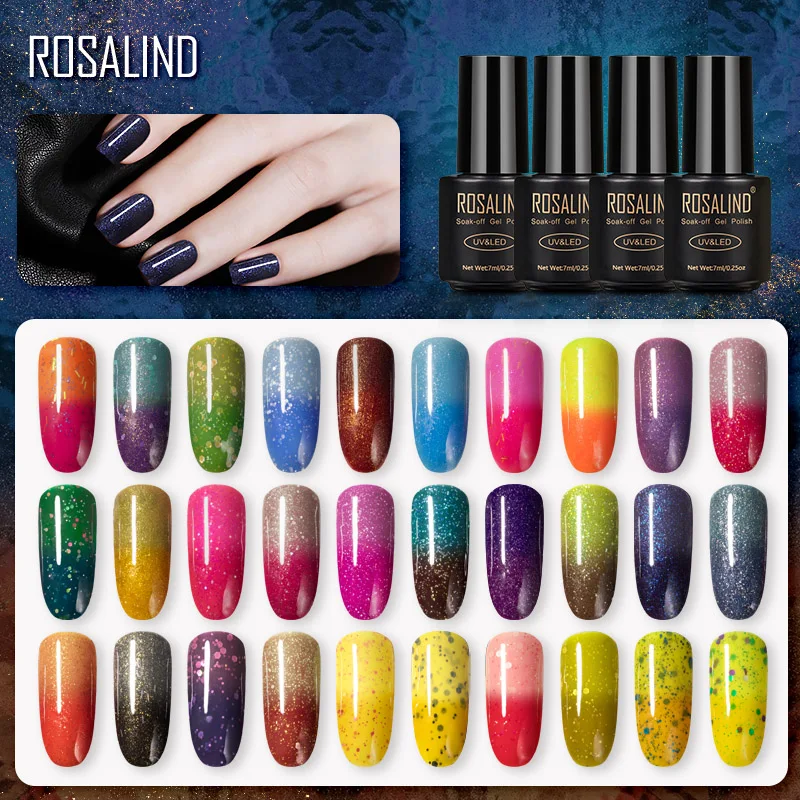 Блестящий гель ROSALIND 7 мл, блестящий меняющий цвет лак, блестящий блеск, отмачиваемый, меняющий температуру, УФ гель, базовое и верхнее покрытие