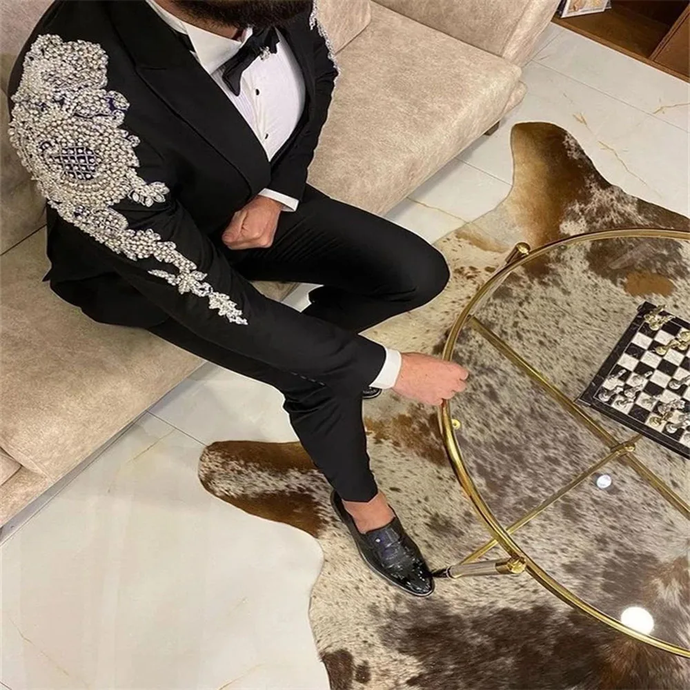 Роскошные индивидуальный заказ Slim Fit Кристаллы бисером черные мужские свадебные костюмы комплект из 3 предметов: пиджак + жилет + штаны, Костюмы для жениха пиджаки смокинги