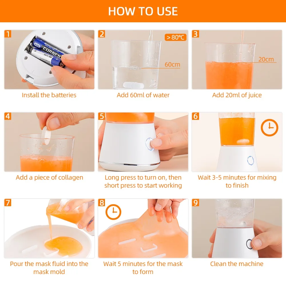 1. Установите аккумуляторы.2. Долгое нажатие кнопки питания, чтобы открыть машину.3. Добавьте 60 мл воды.4. Добавьте 20 мл сока.5. Добавьте кусочек коллагена.6. Нажмите кнопку управления, чтобы начать.7. Налейте жидкость маски в форму маски.8. Нажмите кнопку управления, чтобы закрыть машину.9. Очистите машину.