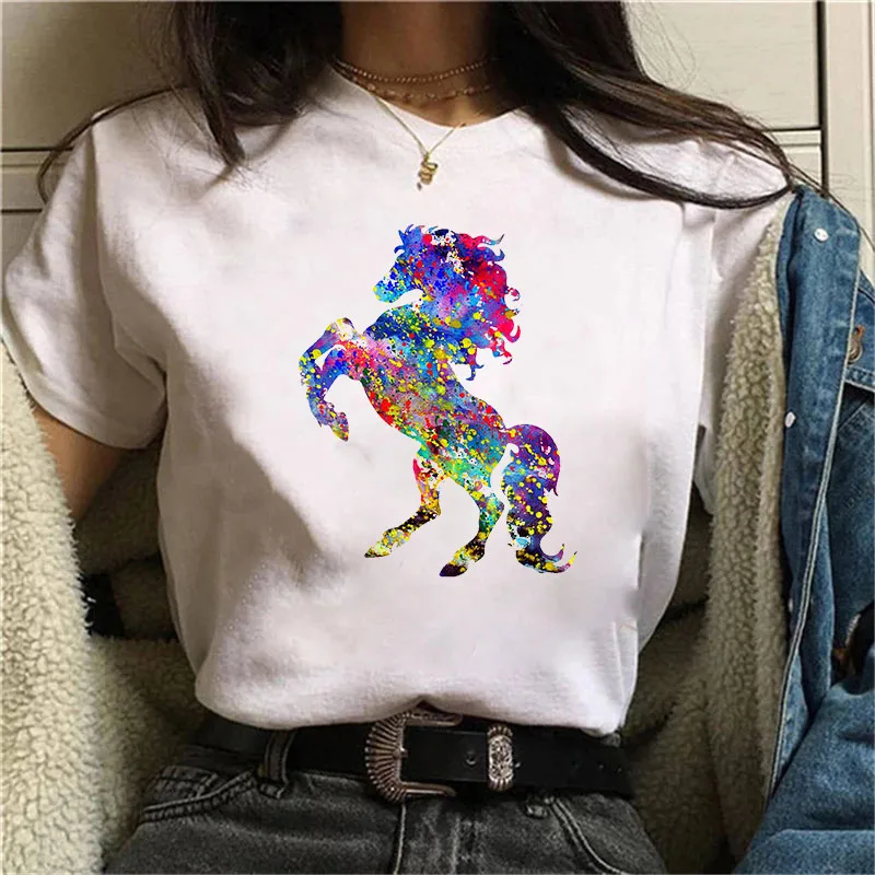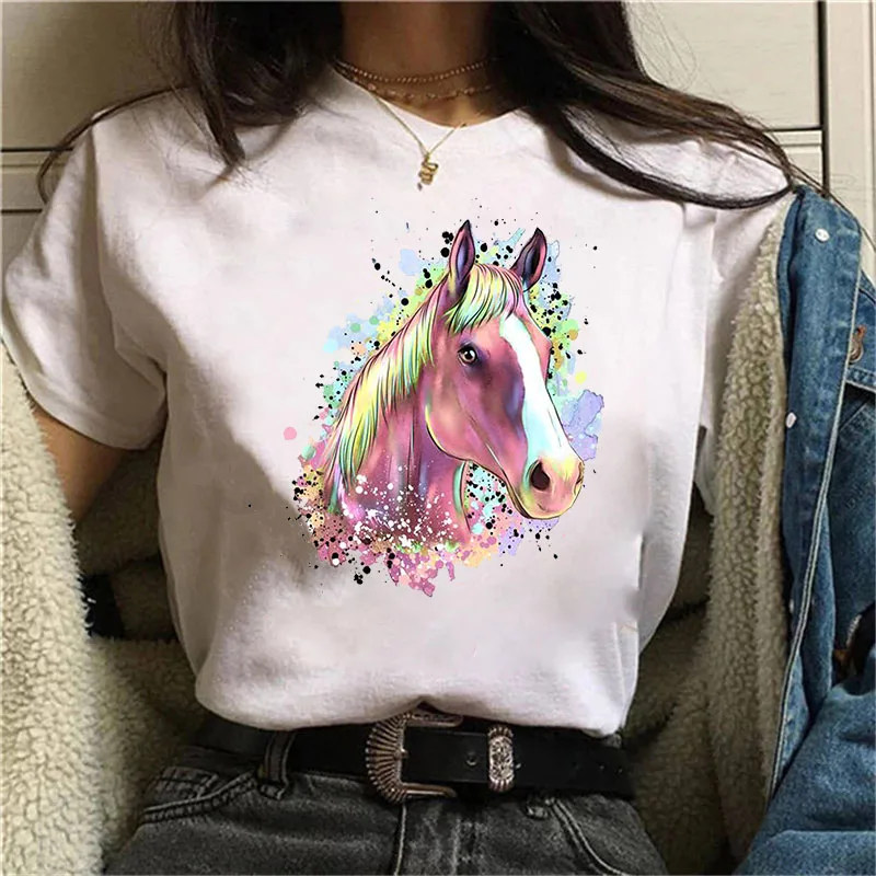 Акварель лошадь футболки для девочек летние футболки с эстетика Графический короткий рукав Футболка Harajuku с О-образным вырезом уличная Футболка свободного кроя женский