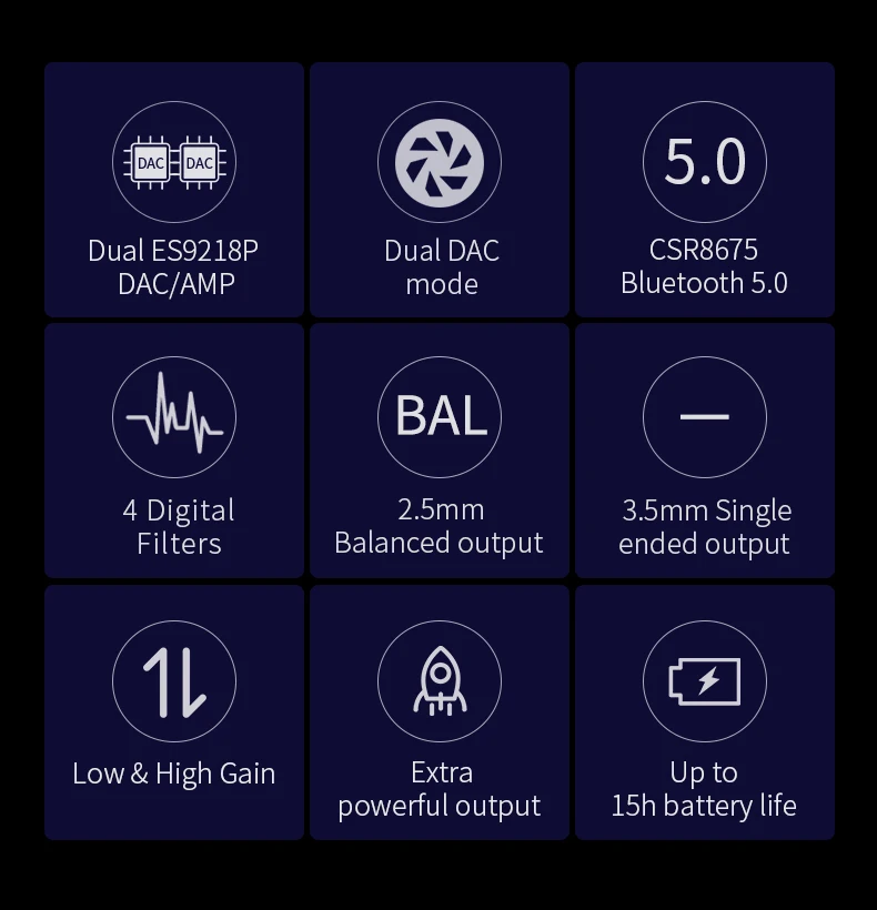 -Двойной ES9218P DAC/AMP-3,5 мм несимметричный и 2,5 мм сбалансированный выход-Высокий коэффициент усиления/низкий коэффициент усиления/двойной режим DAC-91 МВт @ 32 Ом однополосный и 160 МВт @ 32 Ом сбалансированный выход-Сопряжение NFC-Чип Bluetooth 5,0 Qualcomm CSR8675-Поддержка LDAC, HWA LHDC, aptX HD, aptX с низкой задержкой, aptX, AAC и SBC кодеки-Тонкий и изящный дизайн для вашего кармана, поставляется с дополнительным чехол с зажимом-Многофункциональное колесо для полного управления воспроизведением и вызовами-Встроенный микрофон для телефонных звонков и голосовых ассистентов-Может быть подключен к компьютеру, чтобы служить в качестве USB DAC-Срок службы батареи до 15 (SE) / 10 (H) часов