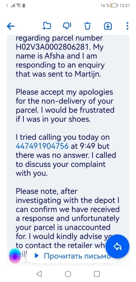 Вы завершили спор. Но товар не был доставлен. Смотрите письмо, которое мне прислала компания доставки. Верните деньги! Это's не моя вина, продавец выбрал компанию по доставке, которая не сделала свою работу (!)