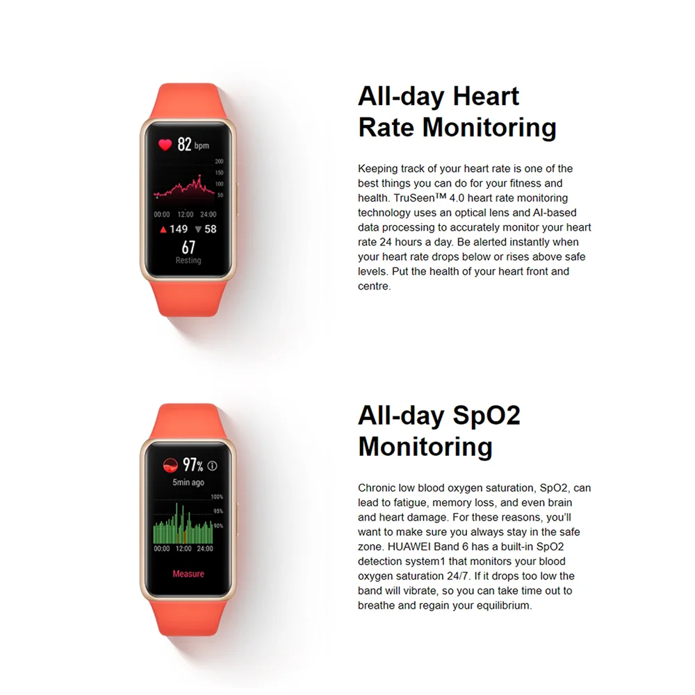 Хроническое низкое насыщение крови кислородом, SpO2, может привести к усталости, потере памяти и даже повреждению мозга и сердца. По этим причинам вы хотите убедиться, что вы всегда находитесь в безопасной зоне. HUAWEI Band 6 имеет встроенную систему обнаружения SpO2 1, которая контролирует насыщенность крови кислородом 24/7. Если он падает слишком низко, браслет будет вибрировать, так что вы можете взять время, чтобы дышать и восстановить равновесие.