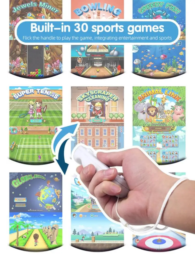 -Например: играя в футбол, вы можете достичь функции игры, развевая геймпад, чтобы управлять движением вашего тела! Когда вы играете в игру, вы можете наслаждаться игрой и тренировать свое тело, чтобы избежать проблем с позвоночником, вызванных долгим сидением!