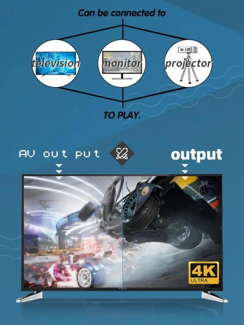 Наши новейшие игровые консоли поддерживают выход 4k h d. Что еще более важно, оба они поддерживают выход домашнего проектора! Больше не нужно беспокоиться о домашнем телевизоре, который не поддерживает выход 4K d и пропускает игру. До тех пор, пока у вас есть проекционное устройство, проектор имеет HD выходной интерфейс, без каких-либо настроек и операций, подключи и работай! Вы можете наслаждаться счастливым временем игры.