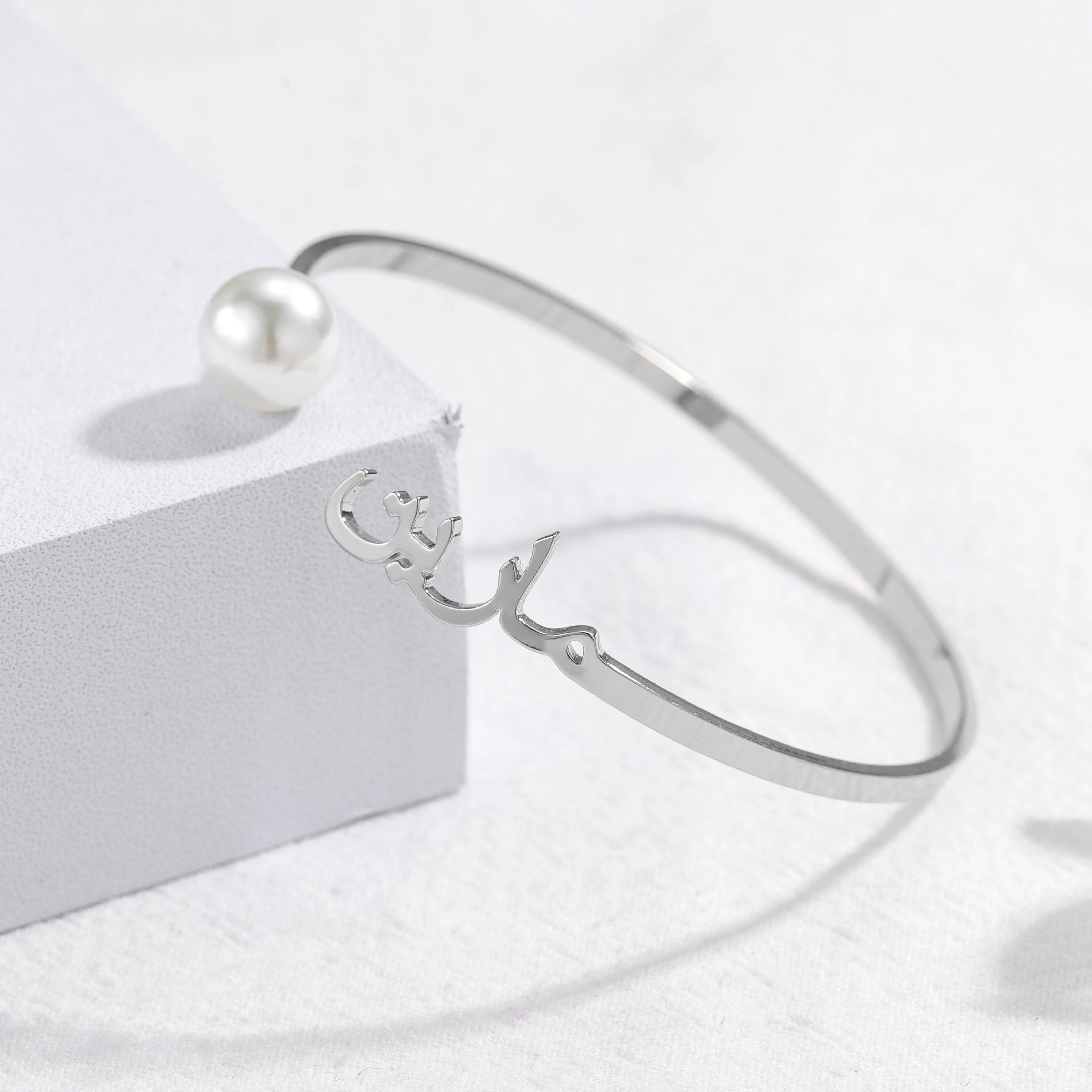 Браслет на заказ с арабским именем для женщин, золотистый браслет из нержавеющей стали с жемчугом, персонализированные браслеты-манжеты для девушек, модные ювелирные изделия, подарки