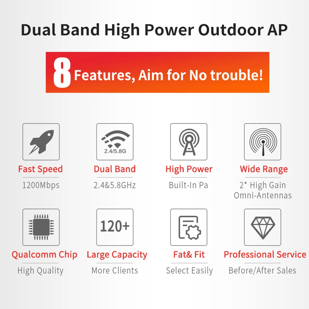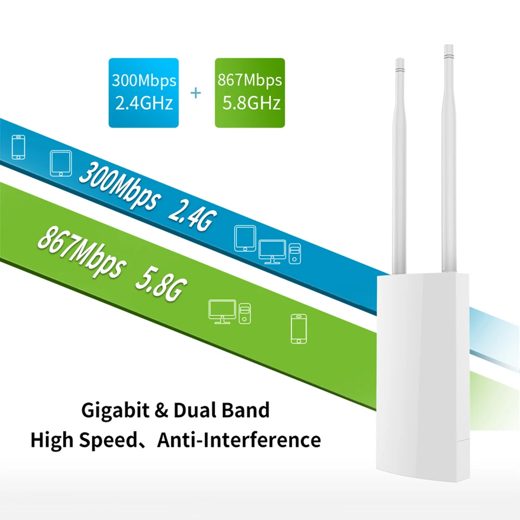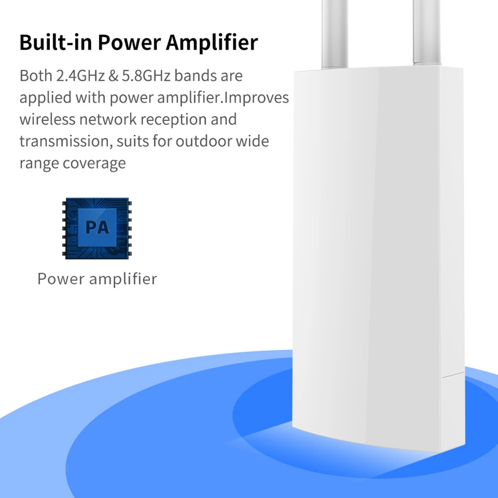 Этот двухдиапазонный ретранслятор WiFi может обеспечить быстрое и стабильное беспроводное соединение благодаря двухдиапазонному дизайну и скорости передачи 1200 м.Этот открытый ретранслятор WiFi может покрыть 360 градусов, а диаметр покрытия Wifi может достигать 60-80 метров.Этот Ретранслятор Сети Wi-Fi оснащен 4 функциями для более широкого применения.Этот расширитель диапазона WiFi удобен для установки и использования. Вы можете установить его на стену или на полюс.Этот ретранслятор Wi-Fi разработан с мощным чипом, который оснащен основной частотой 650 МГц, он может работать плавно.Характеристики:Характеристики оборудования: основная частота Qualcomm QCA9531 650 МГц; ОЗУ: 64 Мб; Флэш-память: 16 Мб; Чип усилителя мощности: SE2576Lx 2.Характеристики антенны: внешняя антенна 5dBi * 2.WiFi: поддержка EE802.11b/g/n.Параметры RF: Мощность передачи: 500 мВт (27dBm), чувствительность приема: -96dBm, Рабочая частота: 802.11b/g/n: 2,412 ГГц 2,484 ГГц.Скорость передачи данных: 11b:1,2, 5,5, 11 Мбит/с/11g:6,9,12,18,24,36,48,54 Мбит/с 11n:MCS0-MCS15 (20 МГц и 40 МГц аналоговая полоса пропускания) /20 МГц: 144,4 Мбит/с/40 МГц: 300 Мбит/с.Физический интерфейс: 1 10/100 Мбит/с WAN RJ45 Ethernet порт C, поддержка POE источника питания (1 шт.), 10/100 Мбит порт LAN RJ45 к порту Ethernet возможна скорость поддержка POE источника питания (1 шт.) Кнопка сброса.Светильник индикатора: питание/WAN/LAN/WiFi.Источник питания: источник питания POE, поддержка 802.3AF/802,3 (до 100 метров), адаптер питания: 48 В 0.32A адаптер питания POE. (настроен)Потребляемая мощность: <8 Вт.Уровень защиты: уровень IP66.MTBF: >250000 ч.Корпус: АБС-пластик, пластиковый корпус.Размер: 353x85x44мм.Рабочая температура: -10 °C ~ 65 °C.Температура хранения: -40 °C ~ 70 °C.Рабочая влажность: 10% ~ 90% RH без конденсацииВлажность хранения: 5% ~ 90% относительной влажности без конденсации.Примечание:Из–за разных компьютерных разрешений может быть небольшое цветовое искажение.Возможны незначительные погрешности из-за различных ручных измерений.Посылка включает в себя:1x адаптер питания.1 руководство пользователя.1 ретранслятор WiFi.
