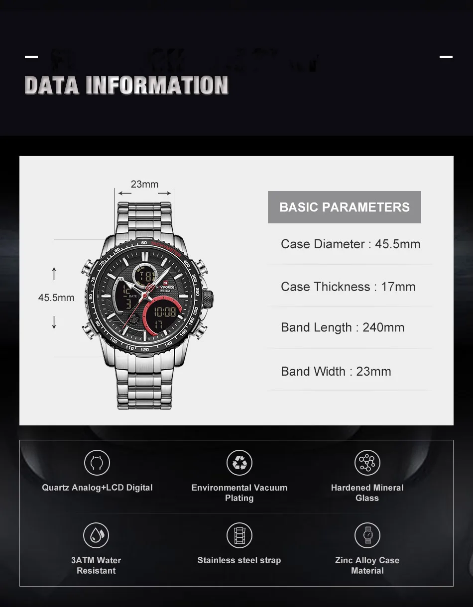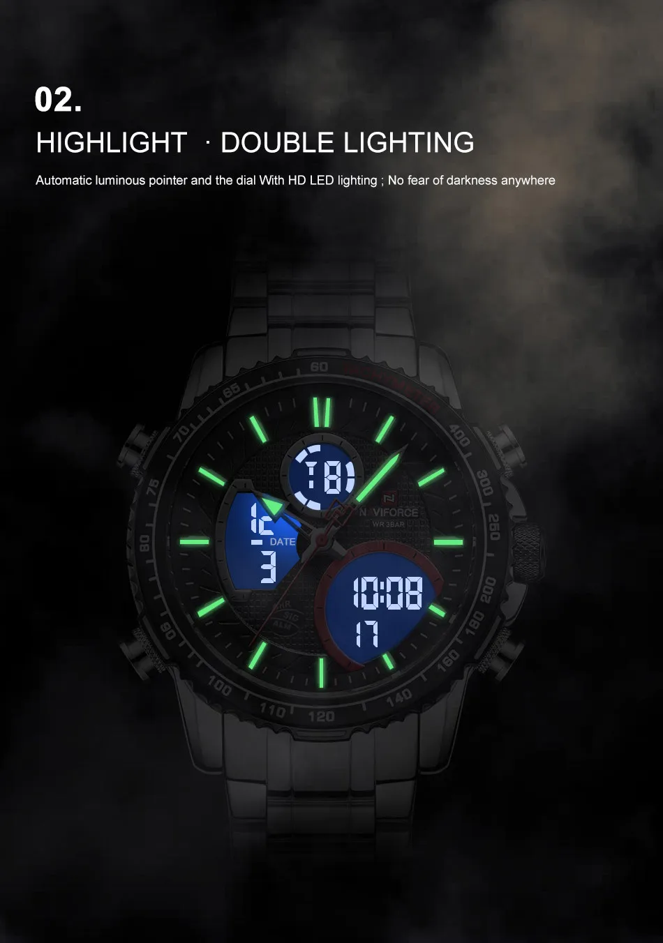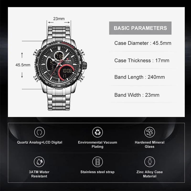 Часы наручные NAVIFORCE Мужские кварцевые, спортивные Водонепроницаемые светодиодные цифровые ударопрочные в стиле милитари, с большим циферблатом, с календарем, черные