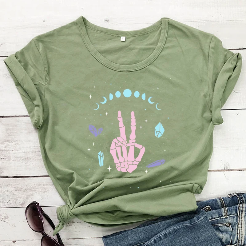 Футболка женская с рисунком скелета, цветной топ с надписью Мир рук, с кристаллами, в винтажном стиле, с фазами хиппи и Луны, в эстетике пастель-гот