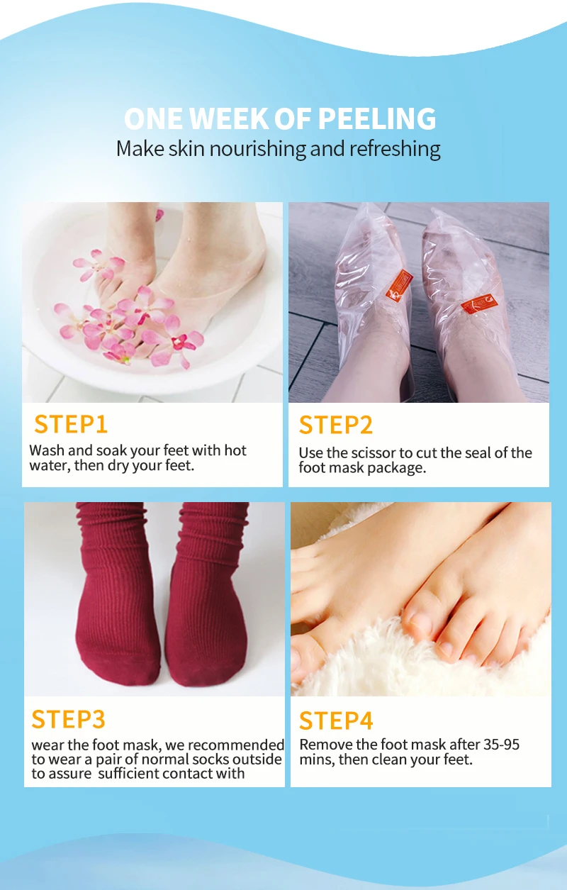 5. Большинство людей начинает очищать омертвевшую кожу после 48 часов использования, но из-за различного типа кожи, кому-то может потребоваться использовать 2-3 пары, пожалуйста, используйте маску для ног снова через 48 часов.