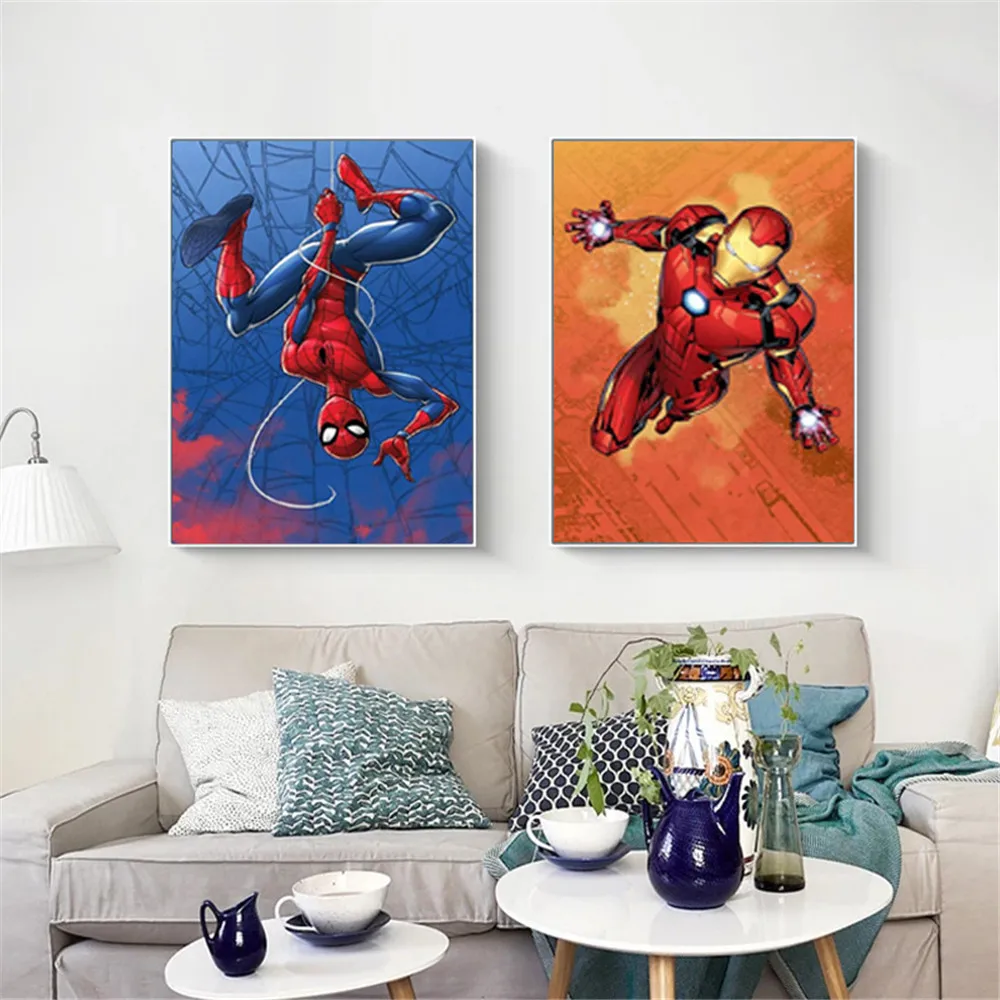Картина на холсте из аниме Супергерои Марвел, настенный постер с изображением Железного человека, Капитана Америка, декор для комнаты, роспись, декоративная картина для детской спальни