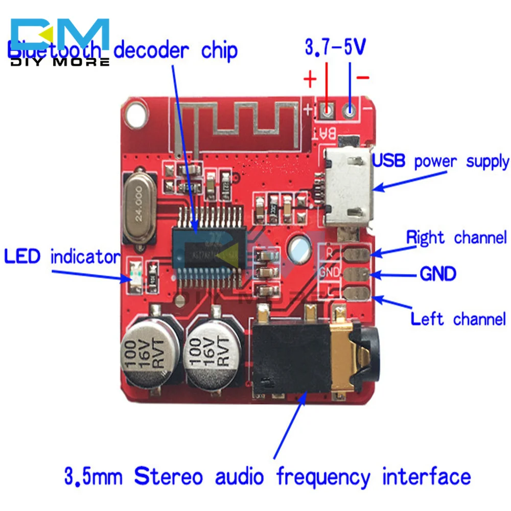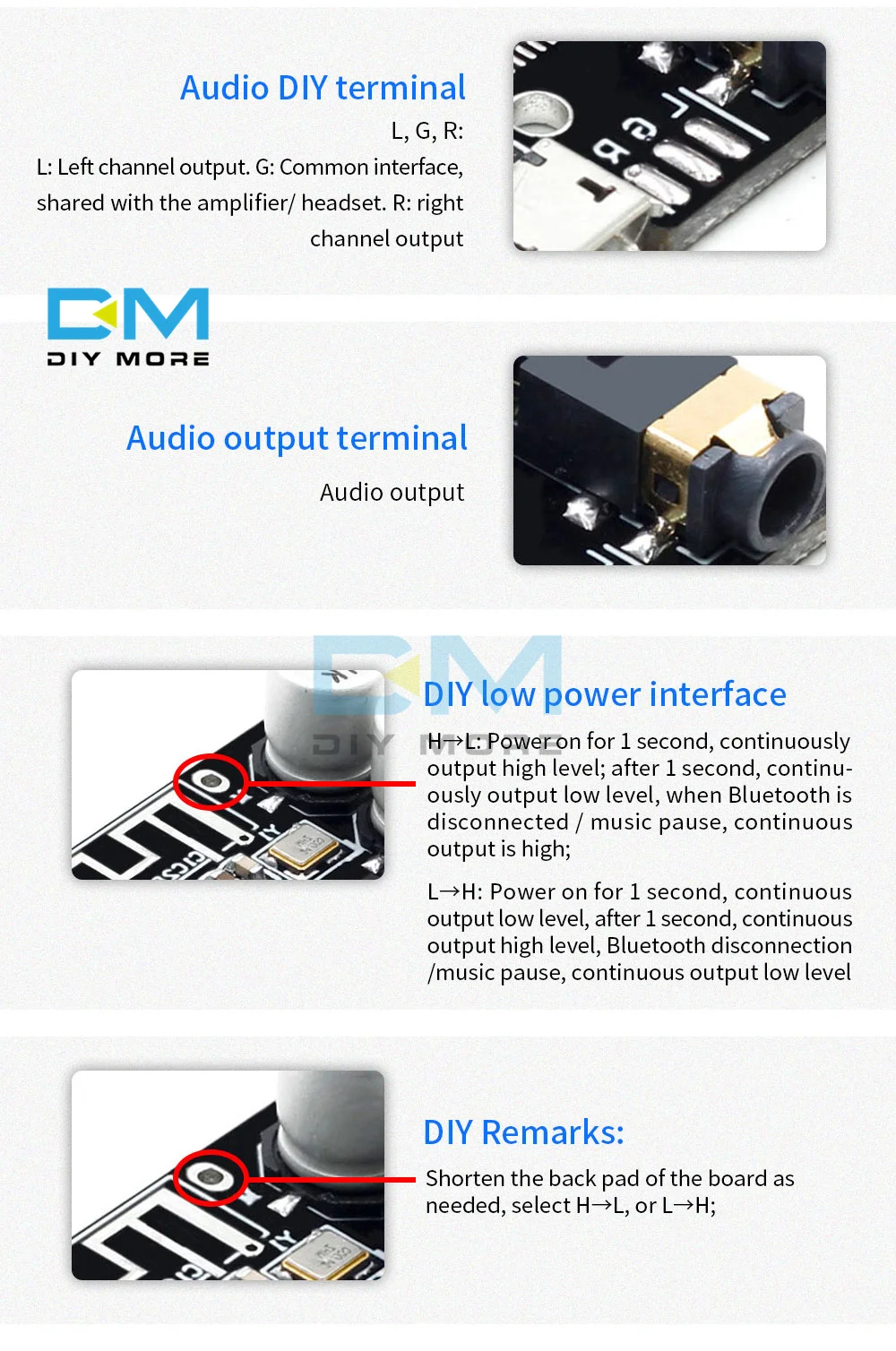 1. Характеристики параметров:Питание 3,7-5VSNR 90 дБTHD + N -70 дБПерекрестие-86 дБDNR 91dBПоддержка профиля A2DP/AVCTP/AVDTP/AVRCP/HFPЛОС> 15 м 2. Детали интерфейса:Универсальный источник питания Micro USB 5V3,7-источник питания 5В накладка внешней 3,7-5V литиевая батарея для подключения к электросетиСветодиодный индикатор Bluetooth режим длинный синий светильник3,5 мм стерео аудио интерфейс Стандартный 3,5 мм Интерфейс, выход стерео источник звука, подключите наушники, подключаться усилители и других устройств 3. Инструкции:После включения питания синий индикатор загорается и переходит в режим Bluetooth; На английском языке отображается «устройство bluetooth готово к сопряжению», указывая, что режим Bluetooth введен и ожидает сопряжения; «XY_BT», который ищет мобильный телефон Bluetooth,-это имя устройства декодирующей платы. Нажмите на соединение, Плата декодера предлагает «устройство bluetooth Подключено успешно», указав, что Плата декодера и мобильный телефон успешно подключены, вы можете воспроизводить музыку.