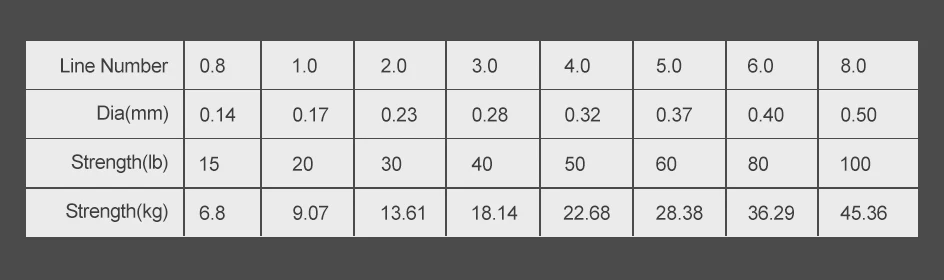 Чрезвычайно высокая прочность на диаметр.Потрясающая тонкая и чувствительная высокая прочность и долговечность.Сопротивляется «копанию» на катушке. ①Передовая широкоугольная технология-гладкая супер линия.② Улучшенная Цветостойкость.③ Длинное и быстрое литье-более гладкое, чем когда-либо.④Супер чувствительность-мгновенное ощущение структуры и ударов.⑤. Исключительная прочность и прочностьHi доступны цвета Hi-vis и Low-vis. 【Детали продукта 】Бренд: JOFМодель: 8 плетеных нитейМетров: 150 м 300 м 500 мФорма: уровеньМатериал: плетеный проводПлавучесть: плавающийНомер лески: 0,8; 1,0; 2,0; 3,0; 4,0; 5,0; 6,0; 8,0 【Parameters】Номер лески 0,8 #: 0,14 мм/15 фунтов/6,80 кгНомер лески 1,0 #: 0,17 мм/20 фунтов/9,07 кгНомер лески 2,0 #: 0,23 мм/30 фунтов/13,61 кгНомер лески 3,0 #: 0,28 мм/40 фунтов/18,14 кгНомер лески 4,0 #: 0,32 мм/50 фунтов/22,68 кгНомер лески 5,0 #: 0,37 мм/60 фунтов/28,38 кгНомер линии 6,0 #: 0,40 мм/80 фунтов/36,29 кгНомер лески 8,0 #: 0,50 мм/100 фунтов/45,36 кг [Список упаковки]1 шт. * леска