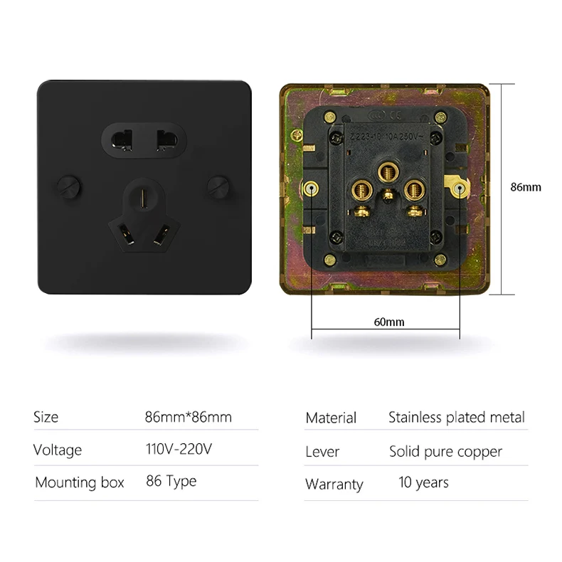 Материал: нержавеющая стальЦвет: черныйНоминальный ток: 10A/16AНоминальное напряжение: 110-250 ВРазмер: 86*86 мм/146*86 ммУпаковка: 1 шт.