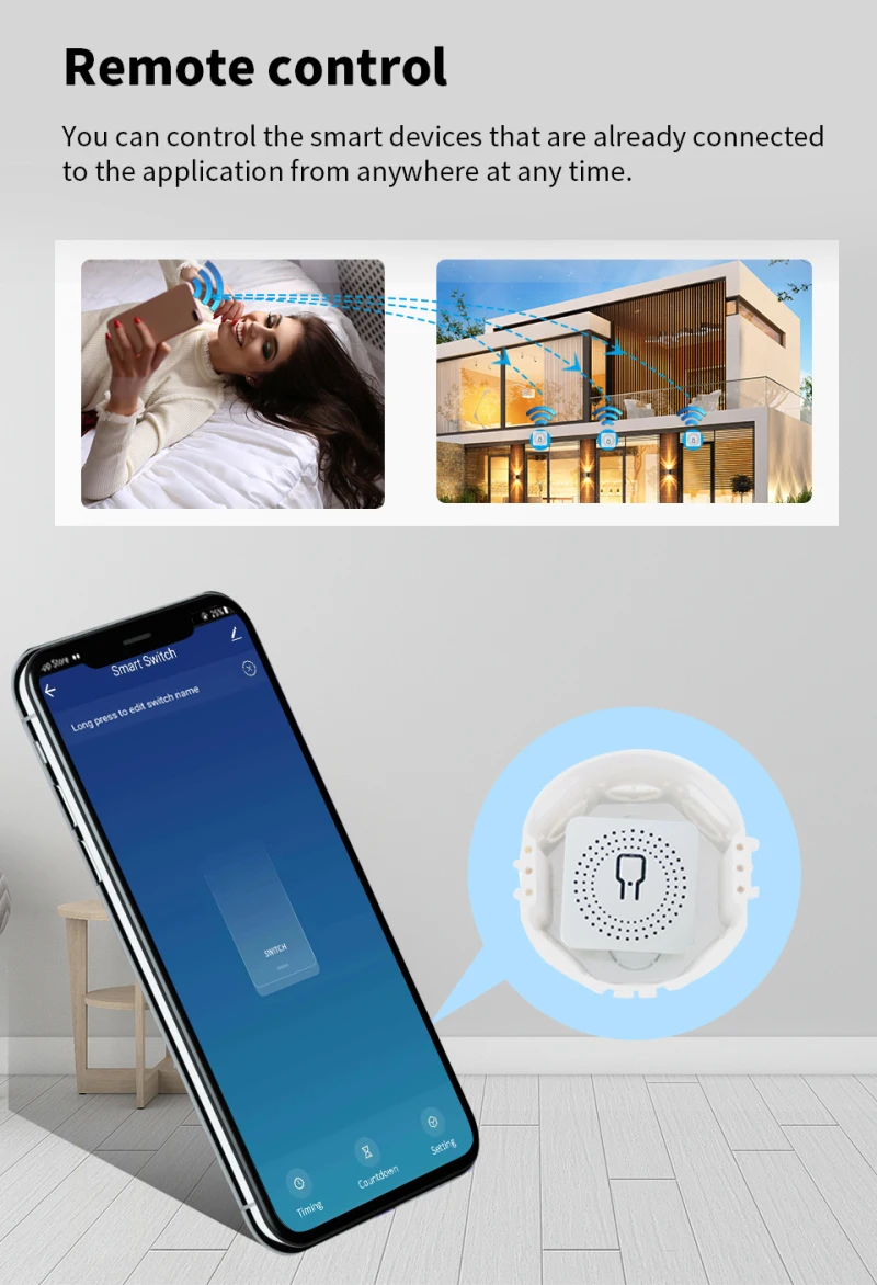 УправлениеПереключатель, время, обратный отсчет и другие функции устройства через мобильный телефон 2. Голосовое управление. Поддержка голосовых помощников, таких как Tmall Wizard, Alexa, GoolHome и т. д., для реализации таких функций, как переключатели;