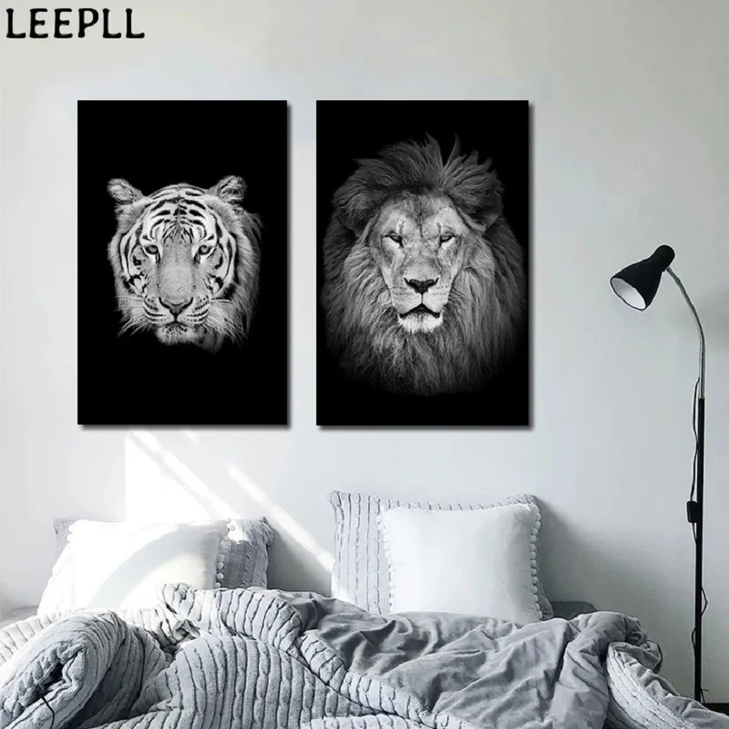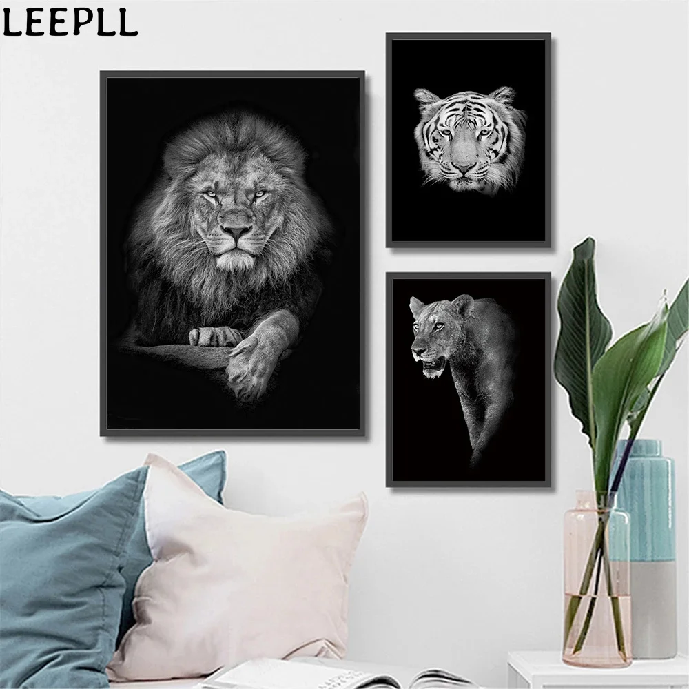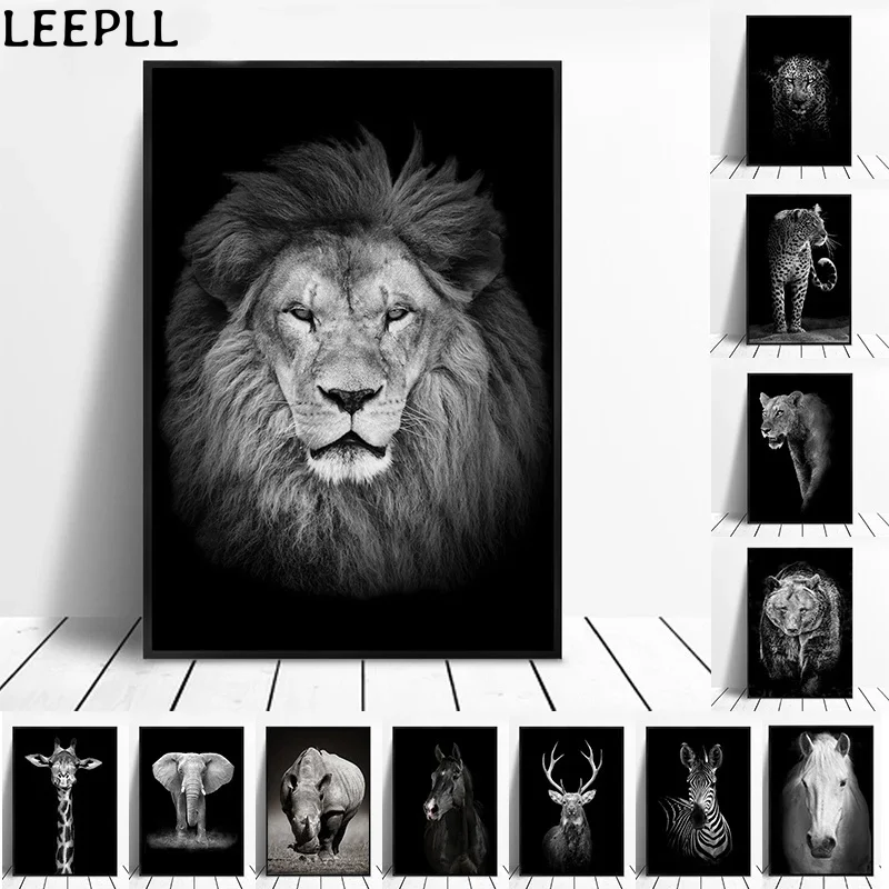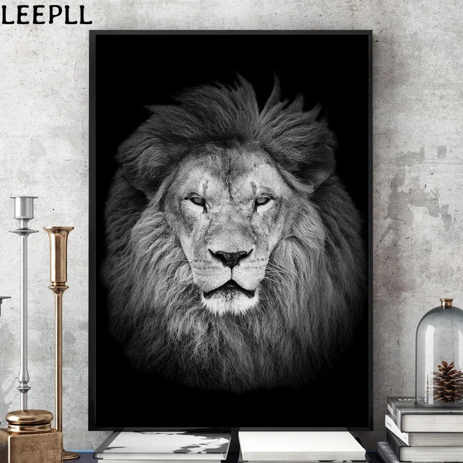 Настенный художественный постер с черно-белыми животными, принт льв...