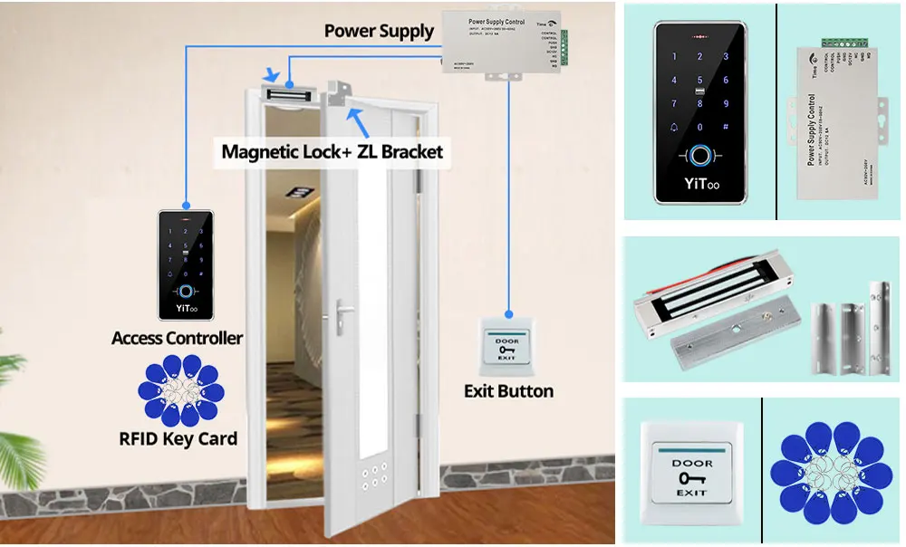Посылка включает в себя: Клавиатура контроля доступа + блок питания + магнитный замок 180 кг + кронштейн ZL + кнопка выхода + 10 брелоковЕсли ваша дверь открыта внутри, то необходимо добавить кронштейн ZL.