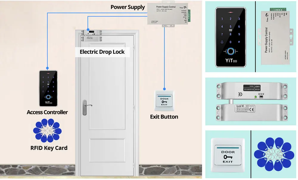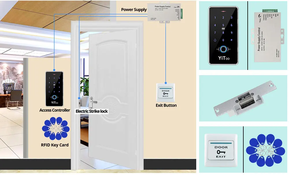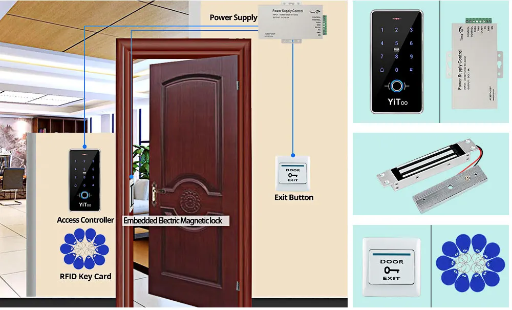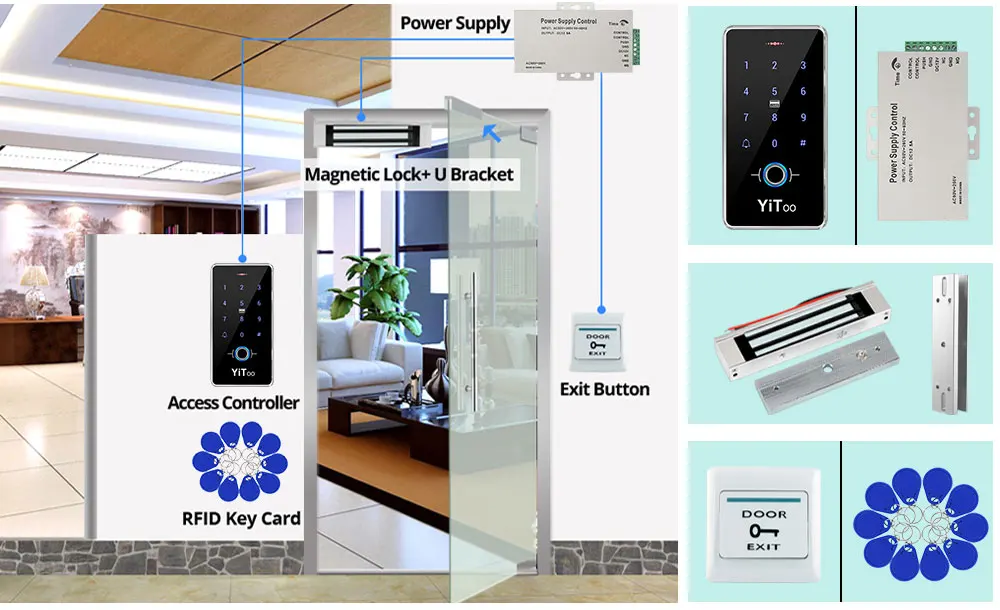 Комплекты для полной системы контроля доступаПолный набор системы охраны для деревянных дверей, металлических дверей и стеклянных дверей и т. Д.Обычно включает в себя клавиатуру контроля доступа, профессиональный источник питания, внутреннюю кнопку выключателя, Электрический дверной замок и некоторые карты брелоков RFID. Вы можете выбрать комплект в соответствии с типом вашей двери. Если вы не знаете, как выбрать, пожалуйста, свяжитесь с нами, спасибо.