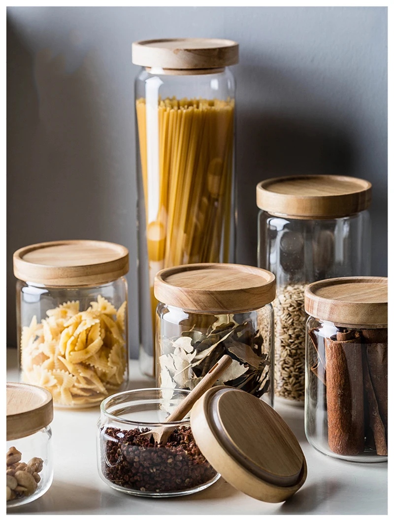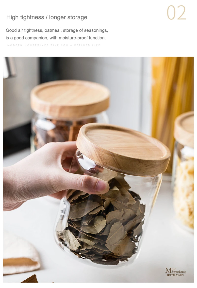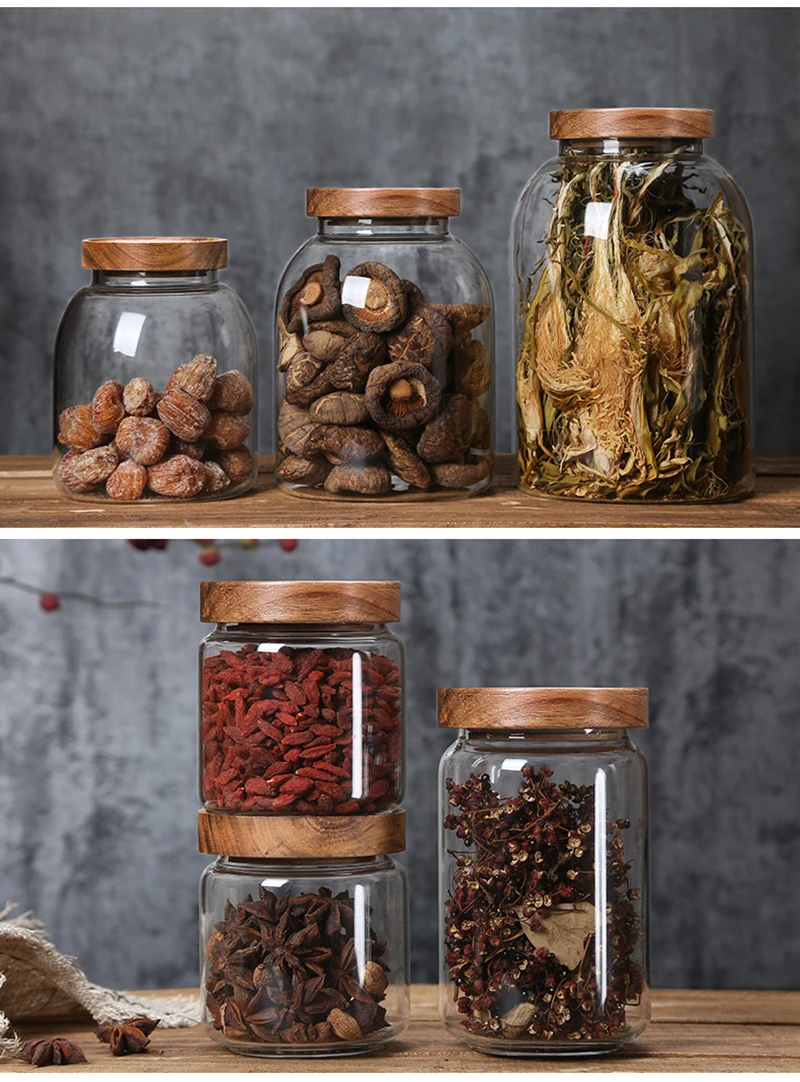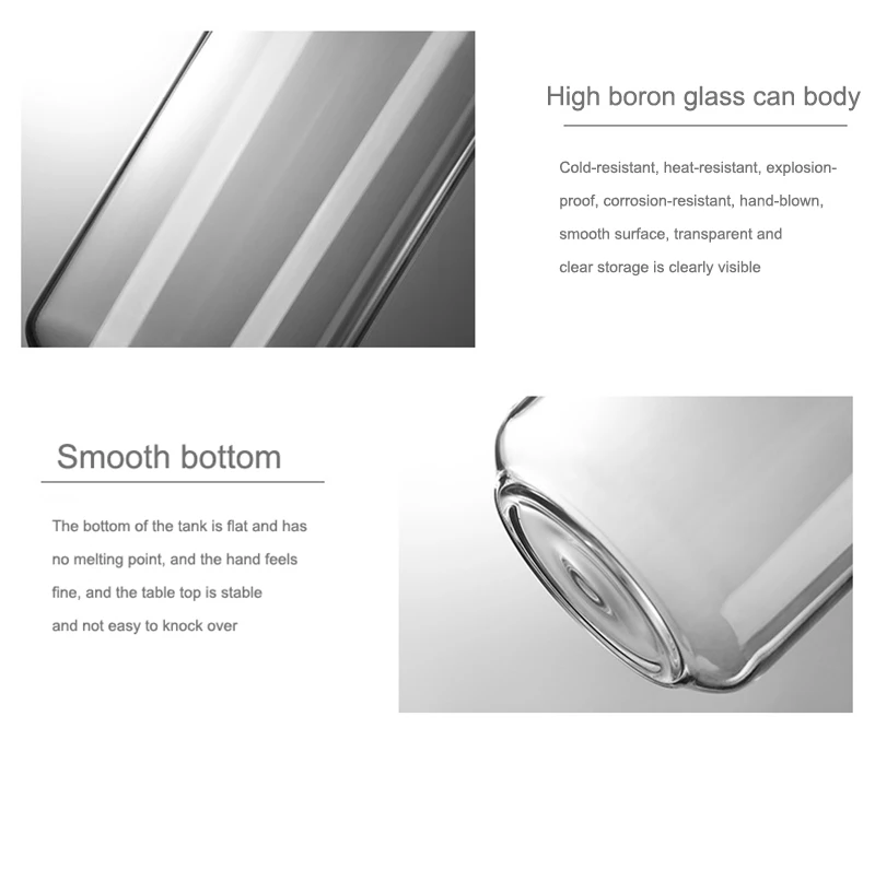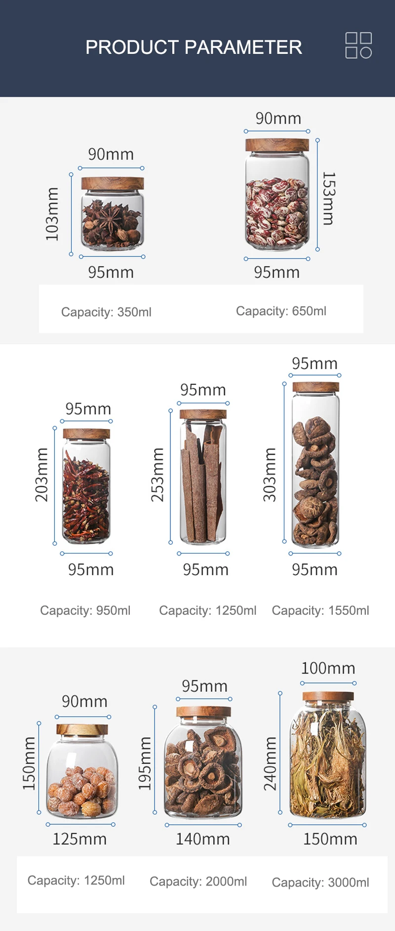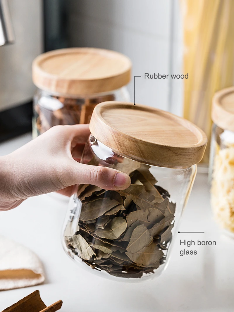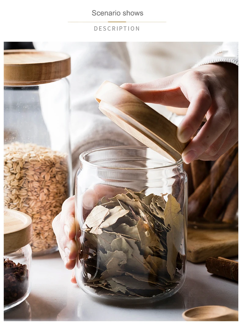 Банки для хранения изготовлены из высококачественного бессвинцового боросиликатного стекла. Изготовлен с высокой прочностью, хорошими воздухонепроницаемыми характеристиками, морозостойкий, жаропрочный, устойчивый к кислотам и щелочам и превосходной коррозионной стойкостью. Они предлагают прозрачную, отполированную основу, которая отлично контрастирует с крышкой из натурального дерева.