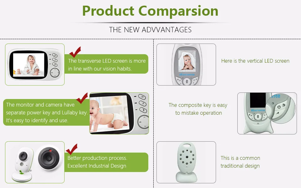 Поперечный ЖК-экран больше соответствует нашим привычкам vidionУ монитора и камеры есть отдельная кнопка питания, Колыбельная и использованиеЛучший производственный процессОтличный Индуктивный дизайн
