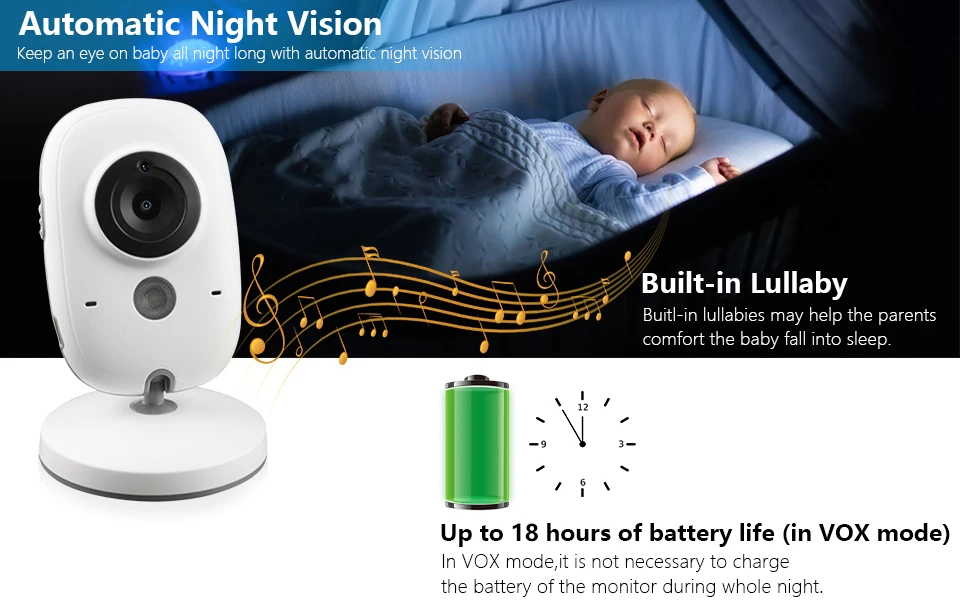 Следите за bany всю ночь с автоматической ночной версиейВстроенная КолыбельнаяВстроенные колыбельные могут помочь родителям успокоить ребенка осеньюДо 18 часов автономной работы (в режиме VOX)В режиме Vox нет необходимости заряжать аккумулятор монитора всю ночь