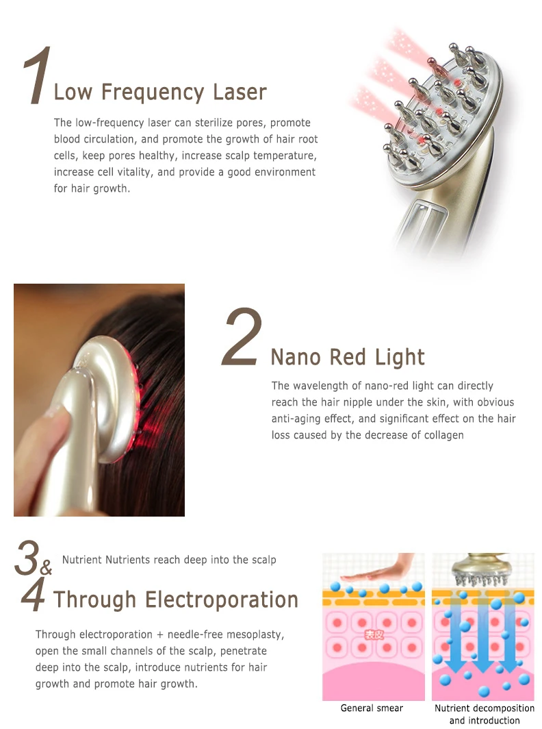 EMS ток может способствовать метаболизму и стимулирует мышцы головы,Способствует циркуляции крови и способствует росту клеток в корнях.