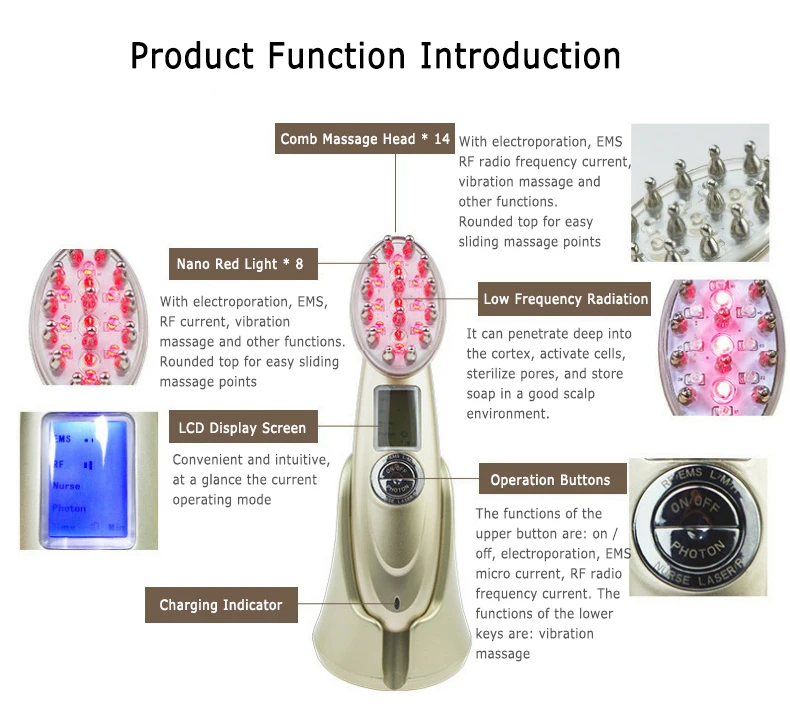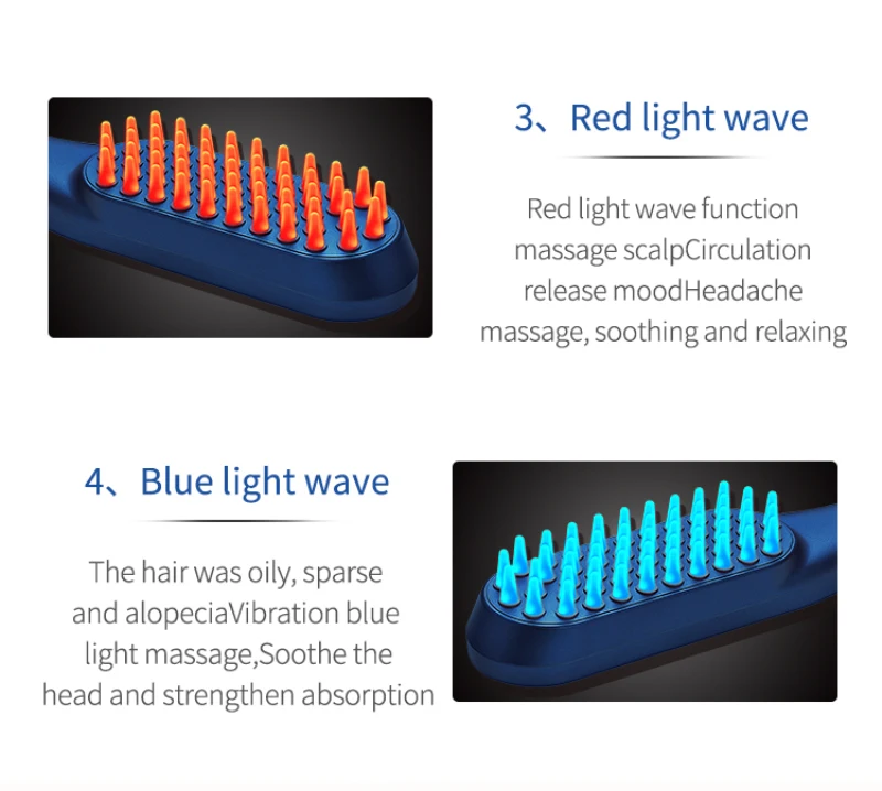 Продукт имеет режим сине-красный светильник: режим вибрации красной волны, массаж циркуляции волос, может полностью облегчить головные боли, успокоить кожу головы; Режим вибрации синей волны, может эффективно уменьшить масло для волос и выпадение волос, успокоить голову и повысить поглощение.