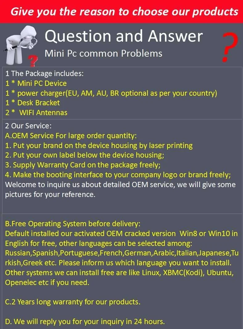 Бесплатная операционная система: По умолчанию установлен нашПробный OEM windows 10/8/7 pro Английский бесплатно, Другие языки могут быть выбраны среди: русский, испанский, португальский, французский, немецкий, арабский, итальянский, японский, турецкий, греческий и т. Д. Пожалуйста, сообщите нам, какой язык вы хотите установить. Другие системы мы можемУстановка бесплатно, как Linux, Ubuntu, Openelec etCЕсли вам нужно.Продавец не несет ответственности за пробную систему OEM.