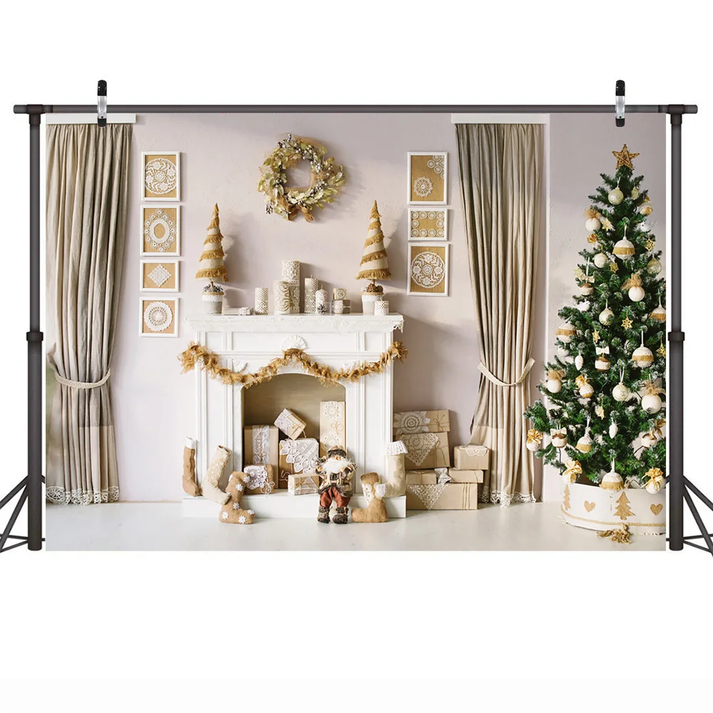 Зимний Рождественский фон камин белые гостиная для взрослых и детей портретной фотосъёмки детей носки подарок на Рождество, занавески с рисунком деревьев украшения