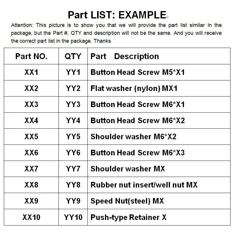Этот полный комплект включает в себя болты, винты, шайбы, втулки, хорошо гайки, нажимные фиксаторы, которые требуются для вашего велосипеда.