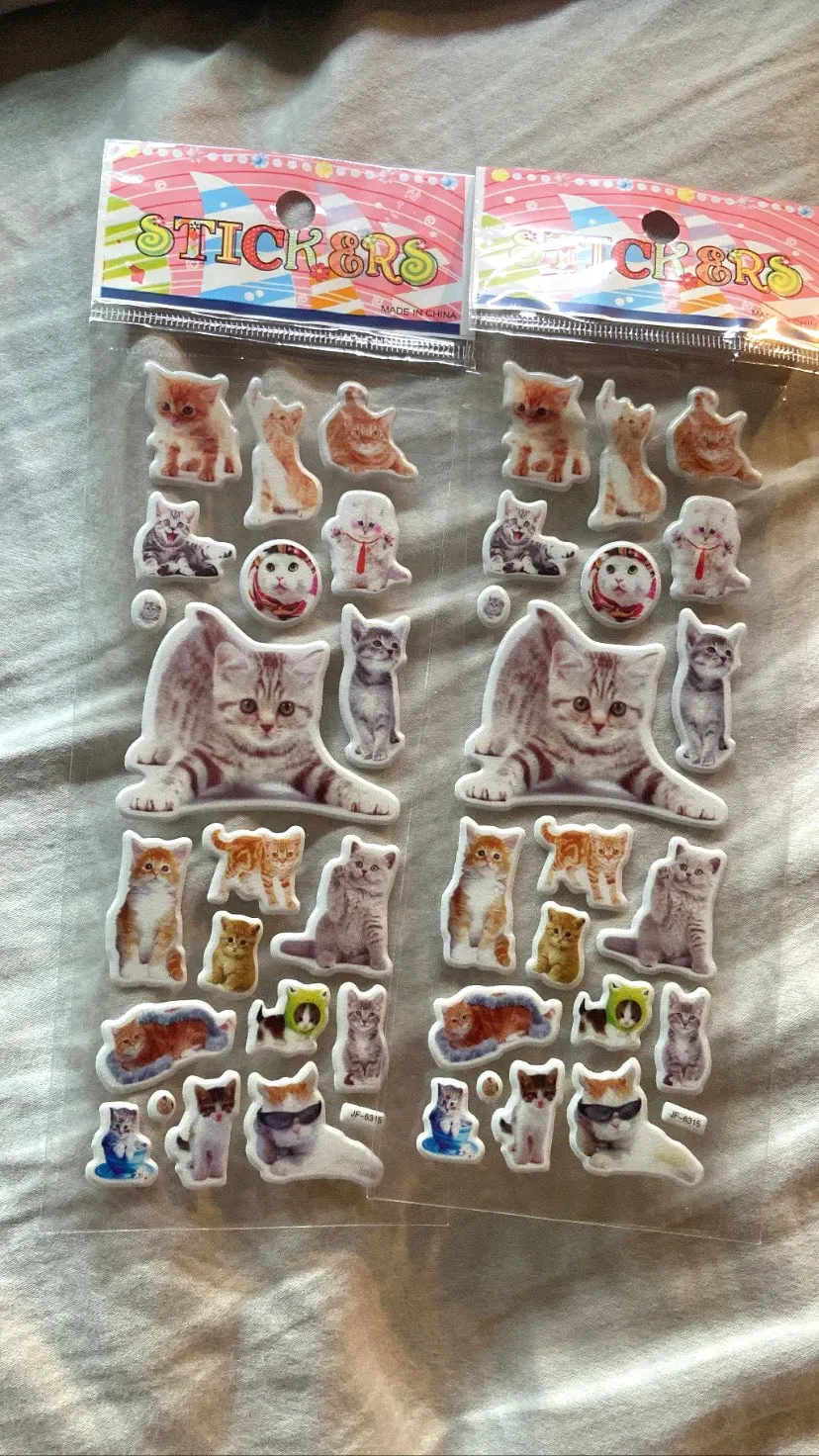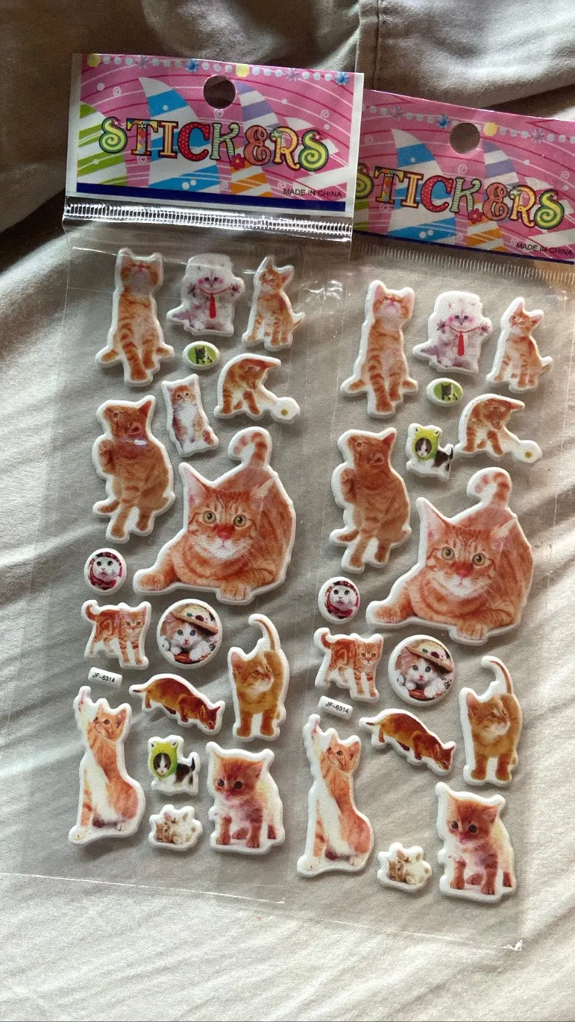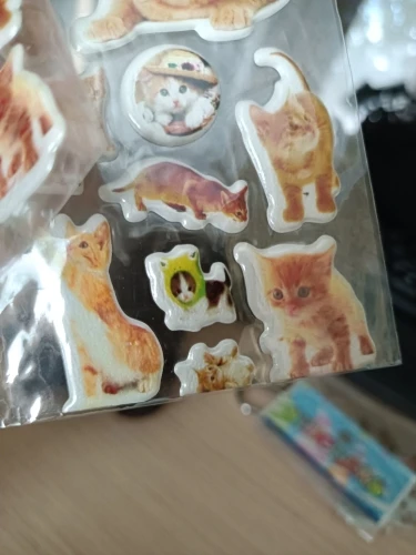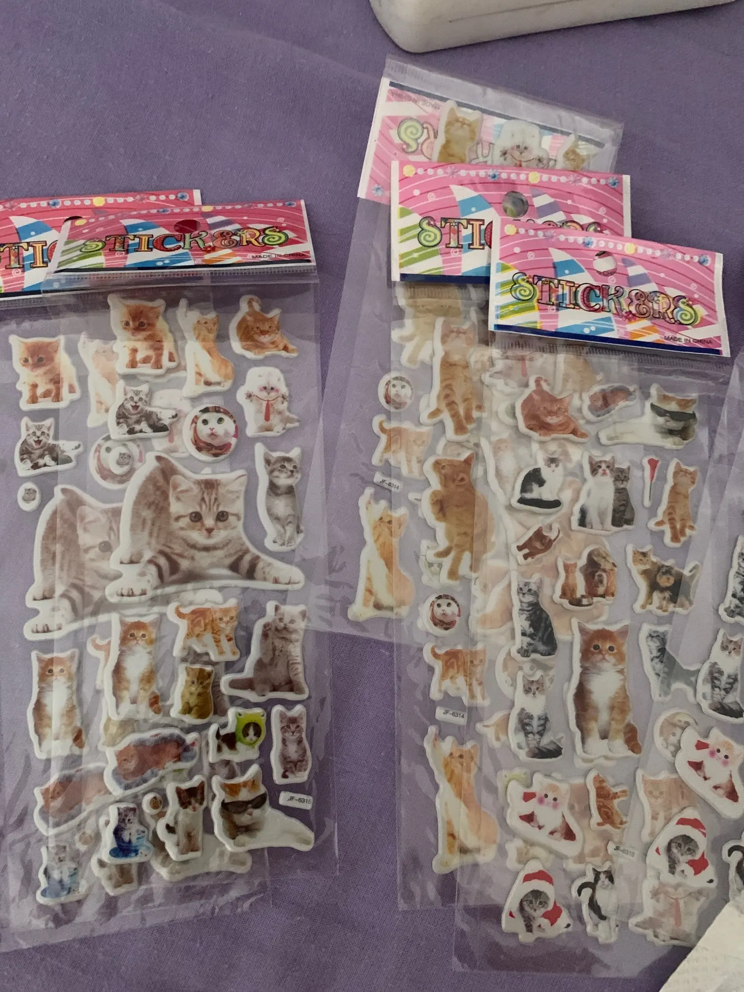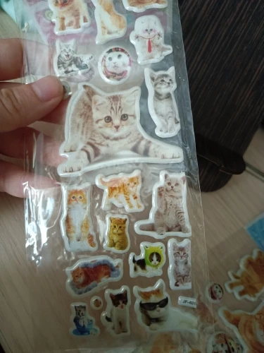 пришло 6 листов, но одного вида пришло 2 штуки,другого 3 и последнего 1 штука,причем 3 штуки пришло того листа, который мне меньше всего понравился :( Наклейки сами конечно достаточно плохого качества,рисунки размытые многие, так же качество портится из-за того,что котам меняли формат очень хреново,растягивая или сжимая их, из-за этого многие картинки немного гипертрофированны,многие повторяются (но это я видела на фото,так что претензий нет),но тк повторы разных форматов, они с разным качеством рисунка. У меня два листа с браком в виде кривого отреза,в следствие чего были повреждены некоторые наклейки (на фото видно). Я в принципе такого качества и ожидала, но обидно что они мельче, чем хотелось (но это наверное мой косяк),ну и обидно за повтор листа и кривой срез. Планирую обклеить ими чехол-книжку,но чехол пока не пришел,так что как придет прикреплю ещё фото чехла с наклейками и скажу хороший ли у них липкий слой.