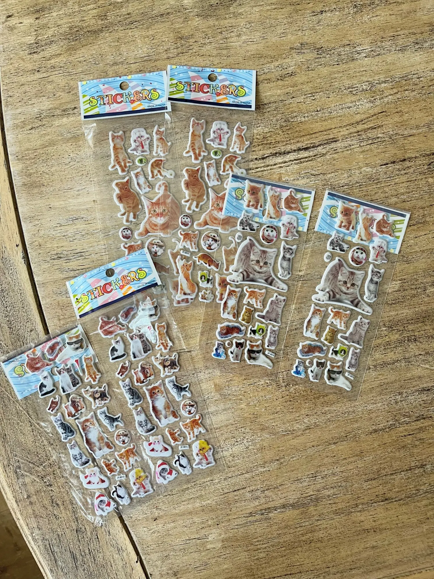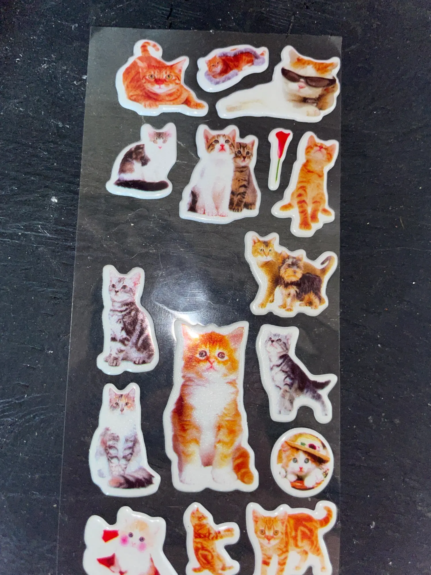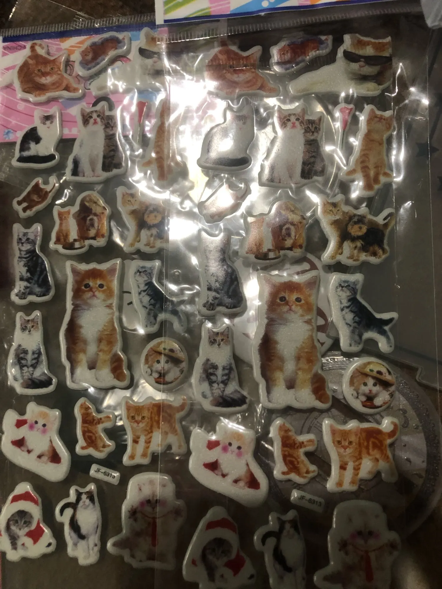 пришло 6 листов, но одного вида пришло 2 штуки,другого 3 и последнего 1 штука,причем 3 штуки пришло того листа, который мне меньше всего понравился :( Наклейки сами конечно достаточно плохого качества,рисунки размытые многие, так же качество портится из-за того,что котам меняли формат очень хреново,растягивая или сжимая их, из-за этого многие картинки немного гипертрофированны,многие повторяются (но это я видела на фото,так что претензий нет),но тк повторы разных форматов, они с разным качеством рисунка. У меня два листа с браком в виде кривого отреза,в следствие чего были повреждены некоторые наклейки (на фото видно). Я в принципе такого качества и ожидала, но обидно что они мельче, чем хотелось (но это наверное мой косяк),ну и обидно за повтор листа и кривой срез. Планирую обклеить ими чехол-книжку,но чехол пока не пришел,так что как придет прикреплю ещё фото чехла с наклейками и скажу хороший ли у них липкий слой.