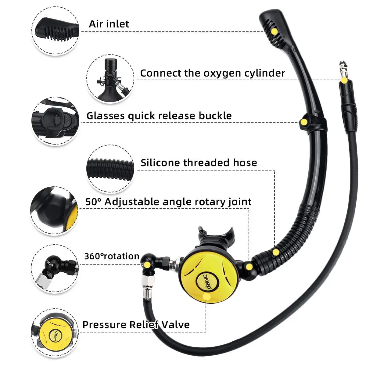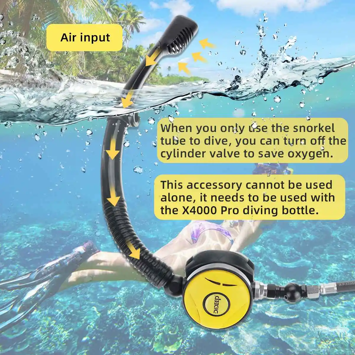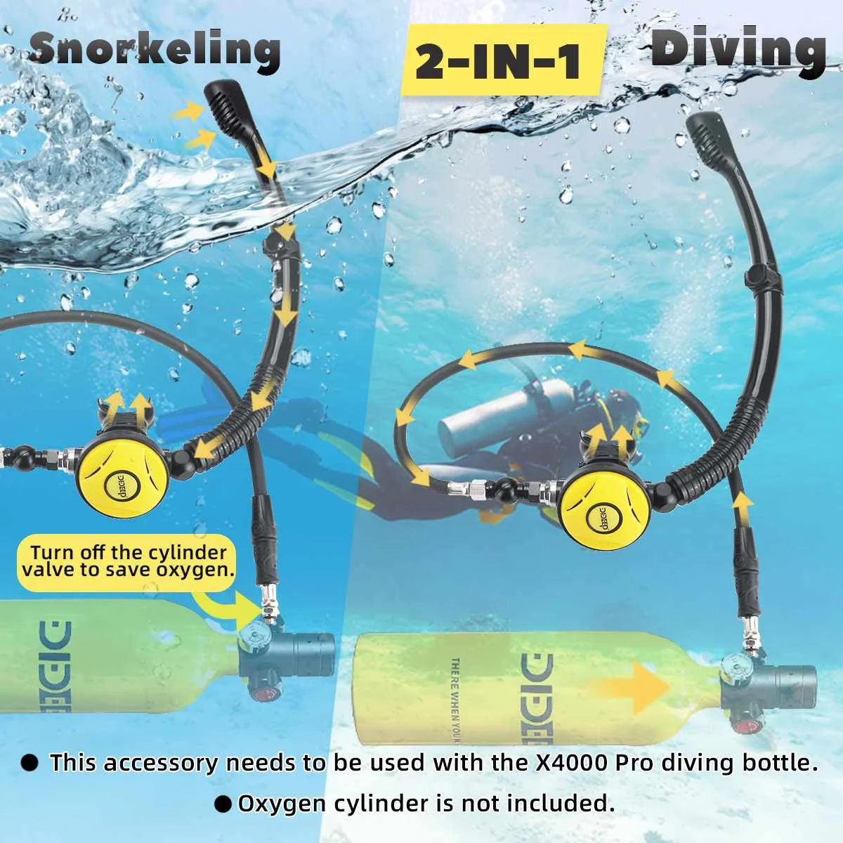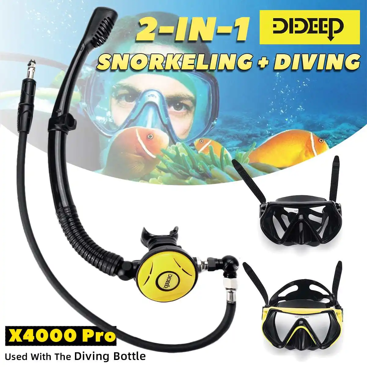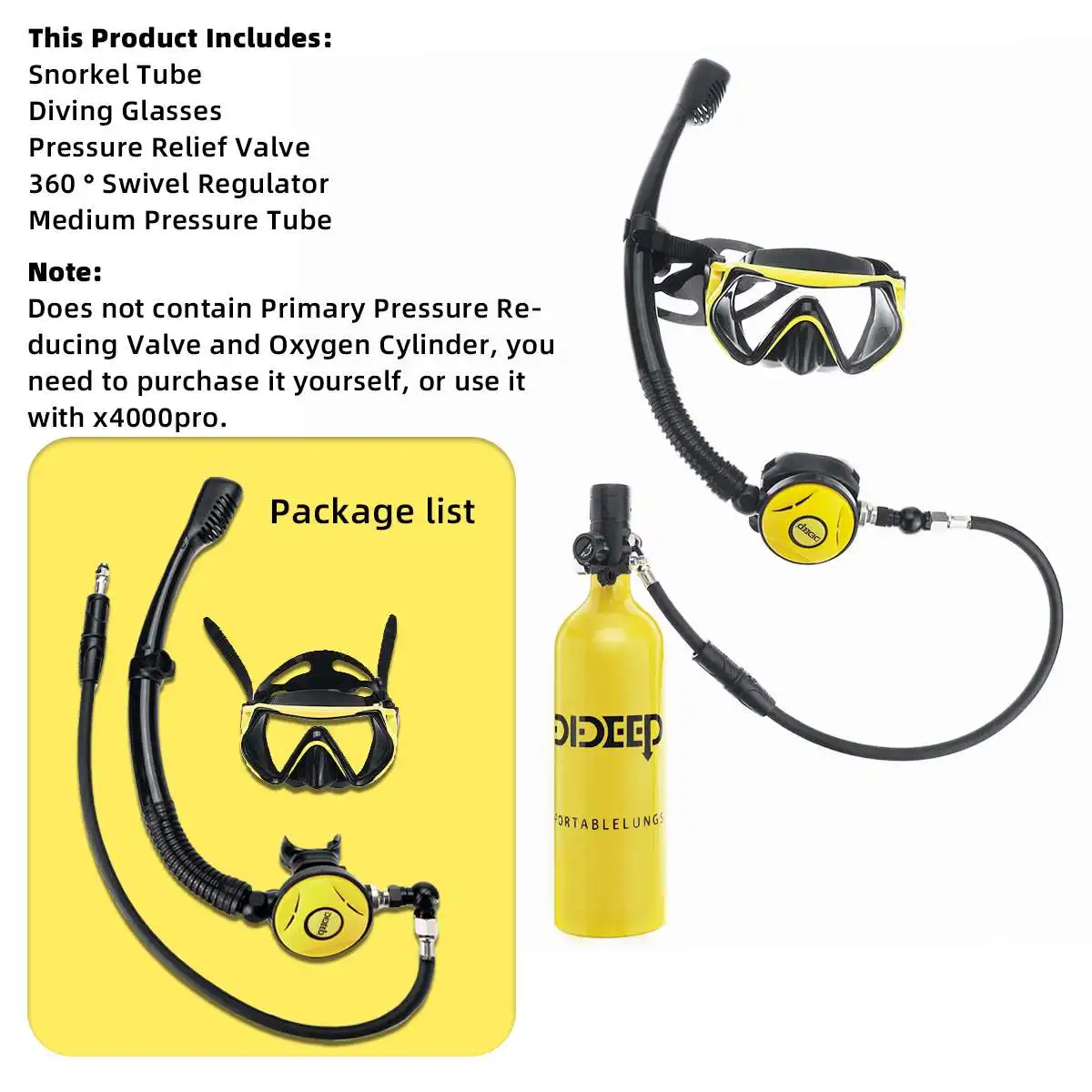 Этот аксессуар не может быть использован отдельно, не содержит первичного редукционного клапана и кислородного цилиндра, вам нужно приобрести его самостоятельно или использовать его с x4000pro.Посылка включает в себя:Трубка для трубки-1 шт.1 x очки для дайвинга1 x предохранительный клапанПоворотный регулятор 360 °-1 шт.1 х трубка среднего давленияСпецификация:Цвета: черный; ЖелтыйМатериал трубки для подводного плавания: силикон + АБСМатериал для маски для лица:-Материал оправы: поликарбонат-Материалы юбки и ремешка: силикон-Материалы линз: линзы из закаленного стеклаРазмер:Очки для дайвинга: 17x 9 см/6,69 "x 3,54"Поворотный регулятор угол вращения: 360 °Трубка для ныряния Угол регулировки: 50 °[Перевод единиц измерения: 1 см = 0,3937 дюйма, 1 дюйм = 2,54 см]Особенности:◆Подводное плавание + Дайвинг 2 в 1 дизайн, при погружении с трубкой, вы можете выключить клапан цилиндра для экономии кислорода.◆Трубка для ныряния и очков для дайвинга имеет быстроразъемную пряжку, которая может быть быстро разделена при необходимости.◆Есть регулируемый угол (50 °) Вращающаяся головка между трубкой и клапаном сброса давления, который подходит для людей с различными гранями и фигурами.◆Маска для дайвинга может принести вам большой опыт, чтобы запечатлеть все вдохновленные высокой четкости подводных видов. Инновационный дизайн закаленного стекла предотвращает холодное, горячее и прессование, обеспечивая защиту ваших глаз.◆Маска для дайвинга силиконовый регулируемый ремешок, быстрый и простой в использовании, без каких-либо утечек, удобная посадка.Вращение на 360 °, более удобное и быстрое Перемещение под водой без препятствий водопроводными трубами.Примечание:-Из-за различных партий продукции детали продукта могут немного отличаться. Если вы хотите узнать разницу, пожалуйста, покупайте внимательно.-Пожалуйста, учитывайте разницу в 1-3 см из-за ручного измерения.-Из-за различных дисплеев и другого светильник, изображение может не отражать фактический цвет товара. Спасибо за понимание.