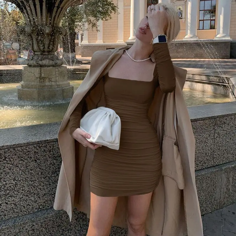 Женское платье с квадратным вырезом, повседневное однотонное Плиссированное облегающее короткое платье с длинным рукавом, модель 2021